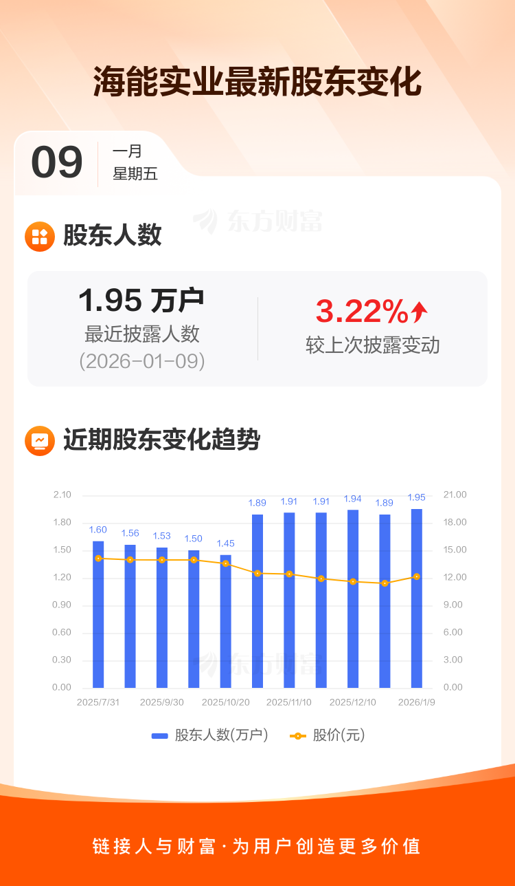 海能实业:截至1月9日最新股东户数1.95万户,较上期增加3.22%