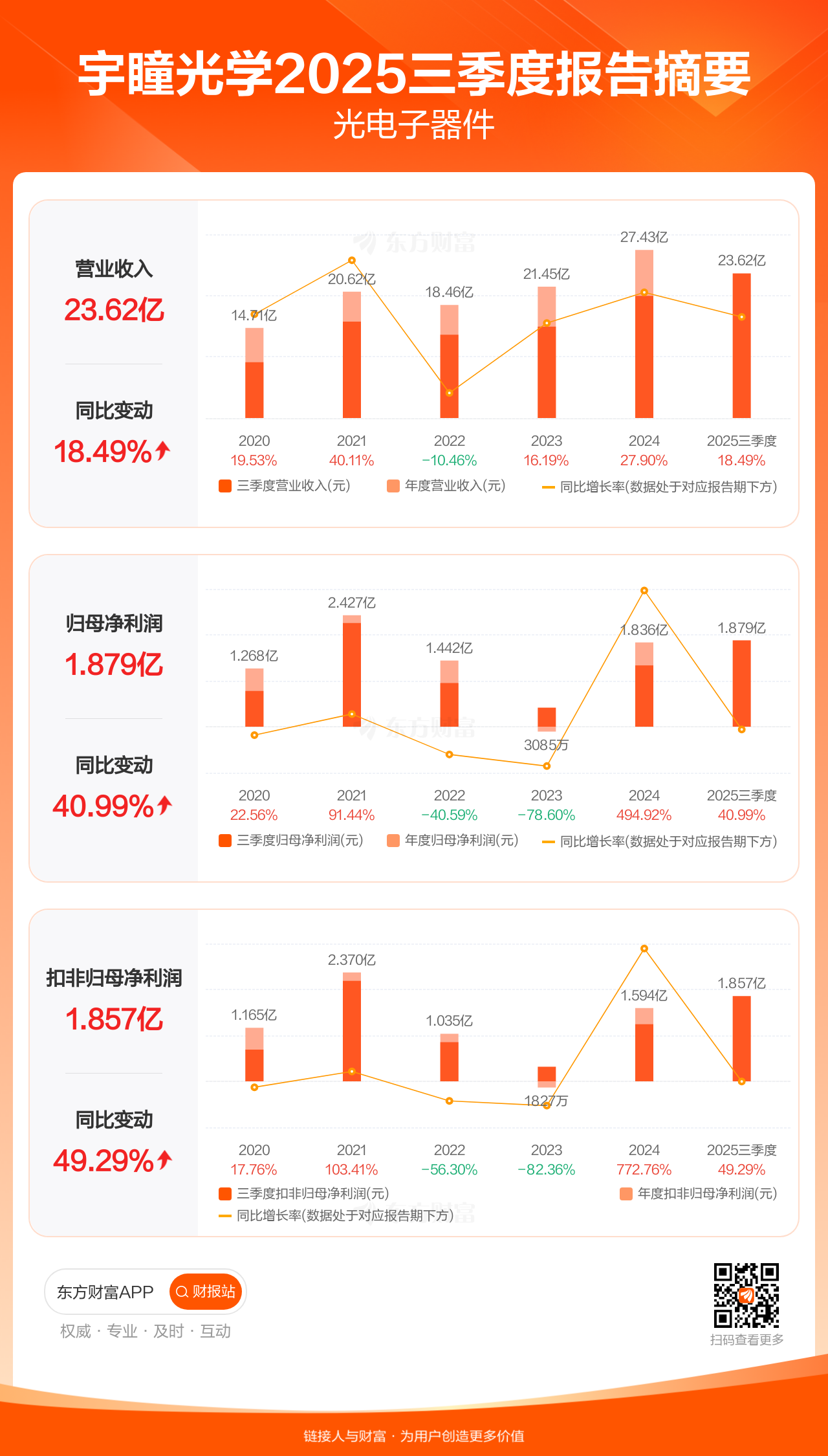 宇瞳光学10月29日发布2025年三季报显示,公司前三季实现营业收入23.62亿元,同比增长18.49%;归母净利润1.88亿元,同比增长40.99%;扣非归母净利润1.86亿元,同比增长49.29%。