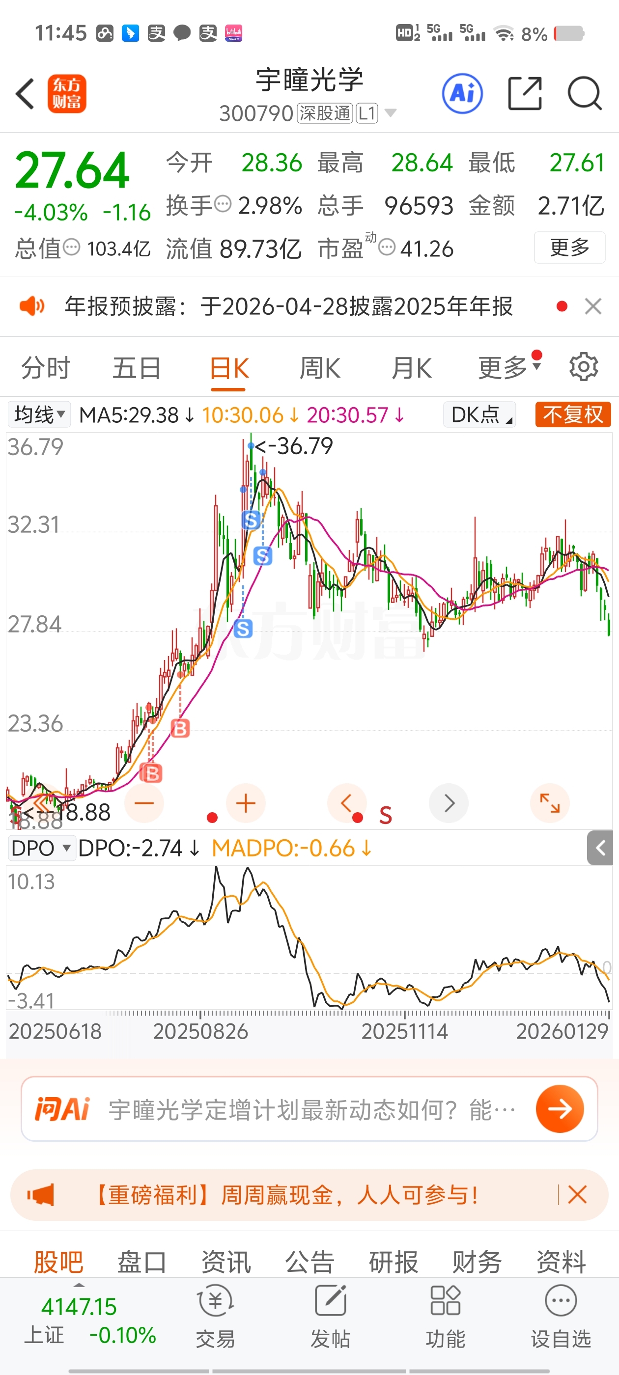 $宇瞳光学(SZ300790)$ 36走的,下午准备进场了。