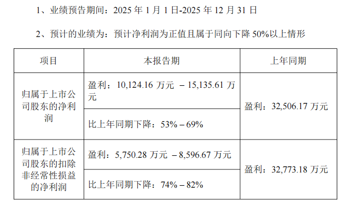 公告显示,仙乐健康预计2025年归母净利润为1亿至1.5亿元,同比下降53%至69%;扣非净利润更是降至5750万至8597万元,同比降幅高达74%至82%。