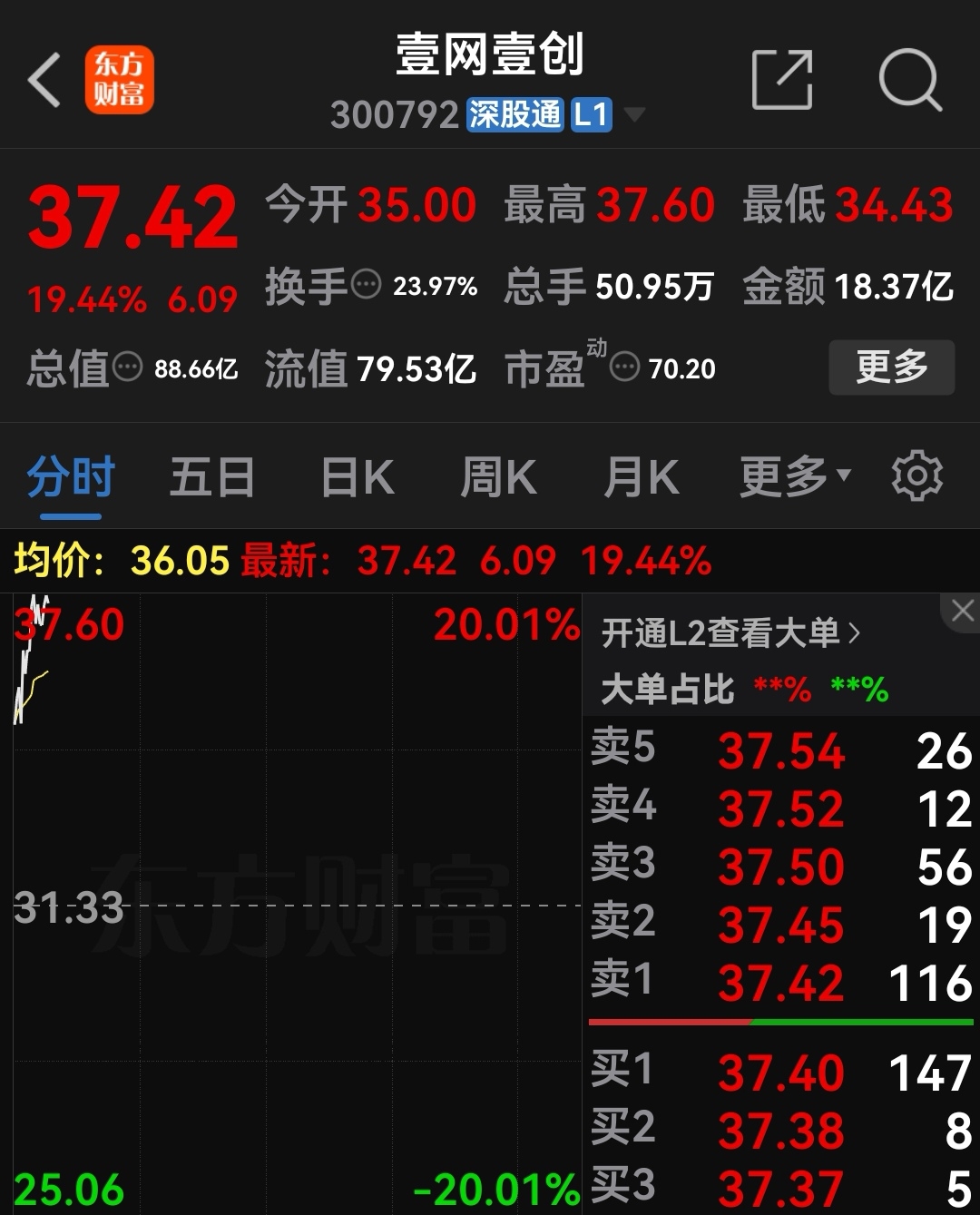 继续以37.6涨停板挂单卖出壹网壹创,没有涨停开盘,本认为要跌了,结果还是又封上