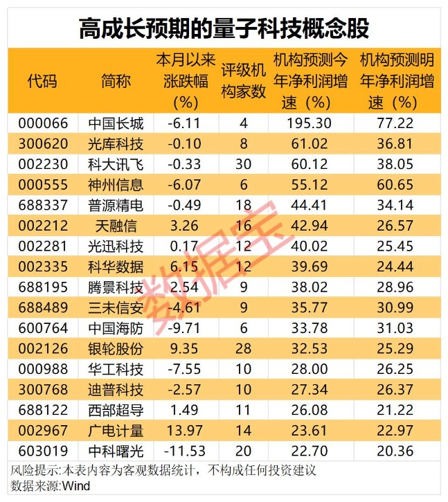 自去年9月24日以来,量子科技概念股平均涨幅近52%,其中艾融软件、禾信仪器、海能达累计涨幅568.18%,233.5%,183.19%。禾信仪器因跨界并购量子技术公司带动股价大涨,公司计划跨界并购国内顶尖的量子计算实验室角逐量子领域。