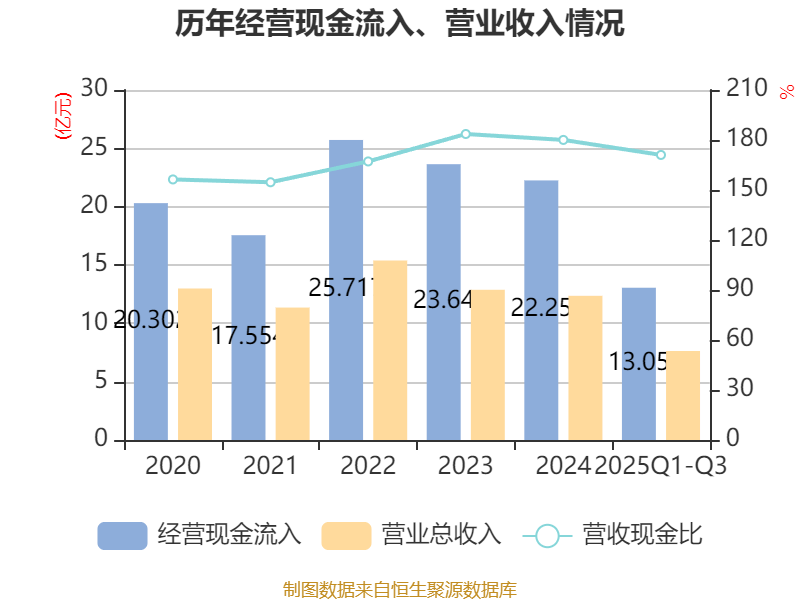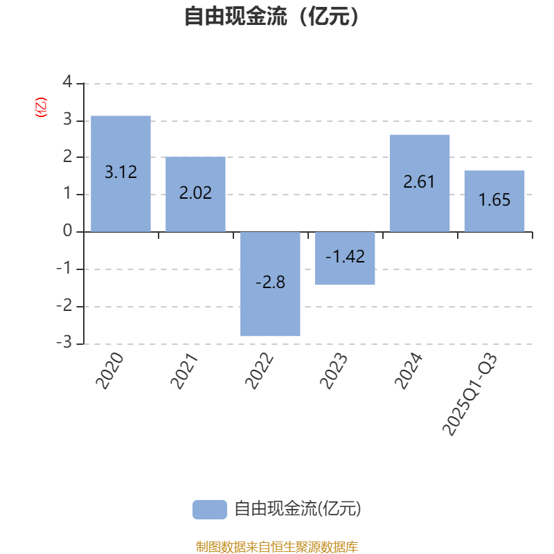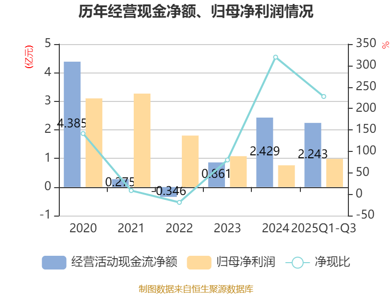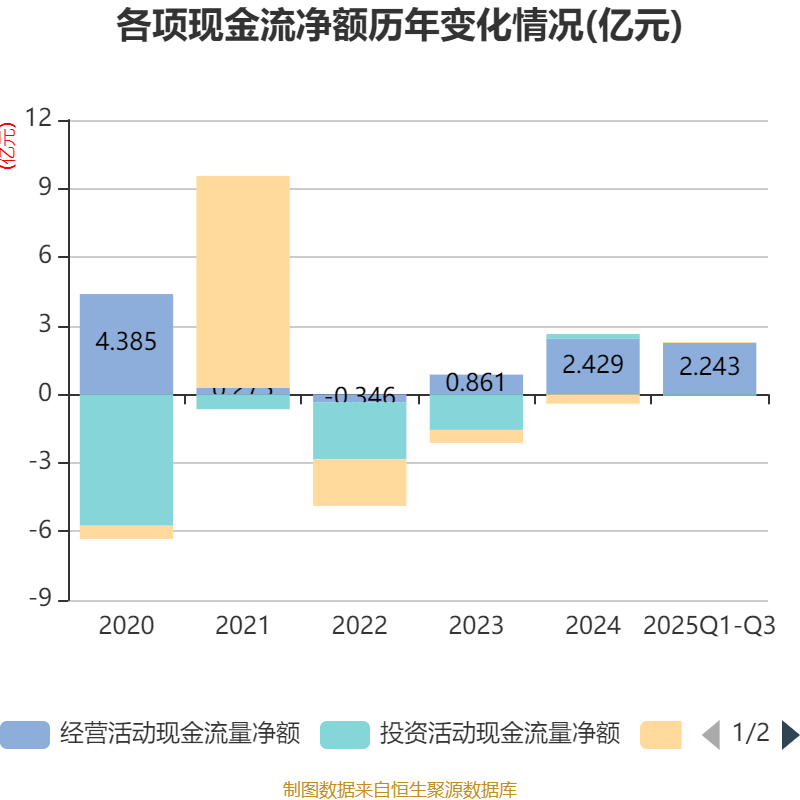 2025年前三季度,公司经营活动现金流净额为2.24亿元,同比增长36.63%;筹资活动现金流净额428.48万元,同比增加5026.38万元;投资活动现金流净额-674.82万元,上年同期为2777万元。