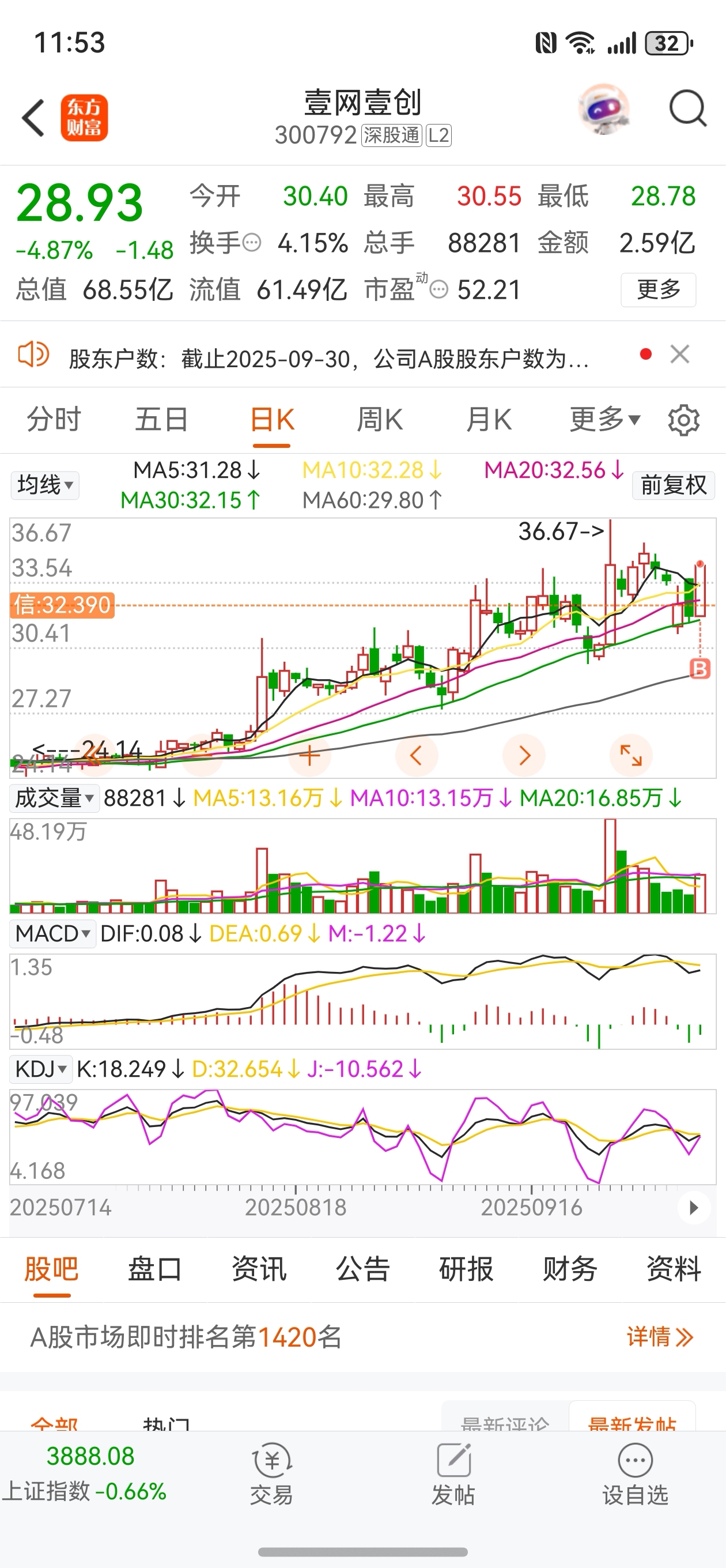 $壹网壹创(SZ300792)$ 我发现我有毒买完就开始下跌了泥蚂