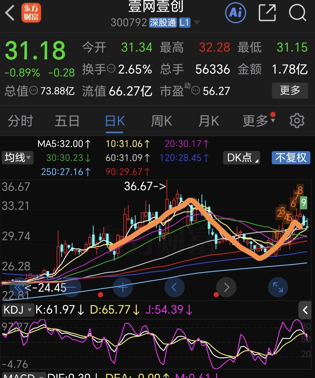 $壹网壹创(SZ300792)$ 这不就是M头了,过半个月,就是另一个W底,应该会过36了