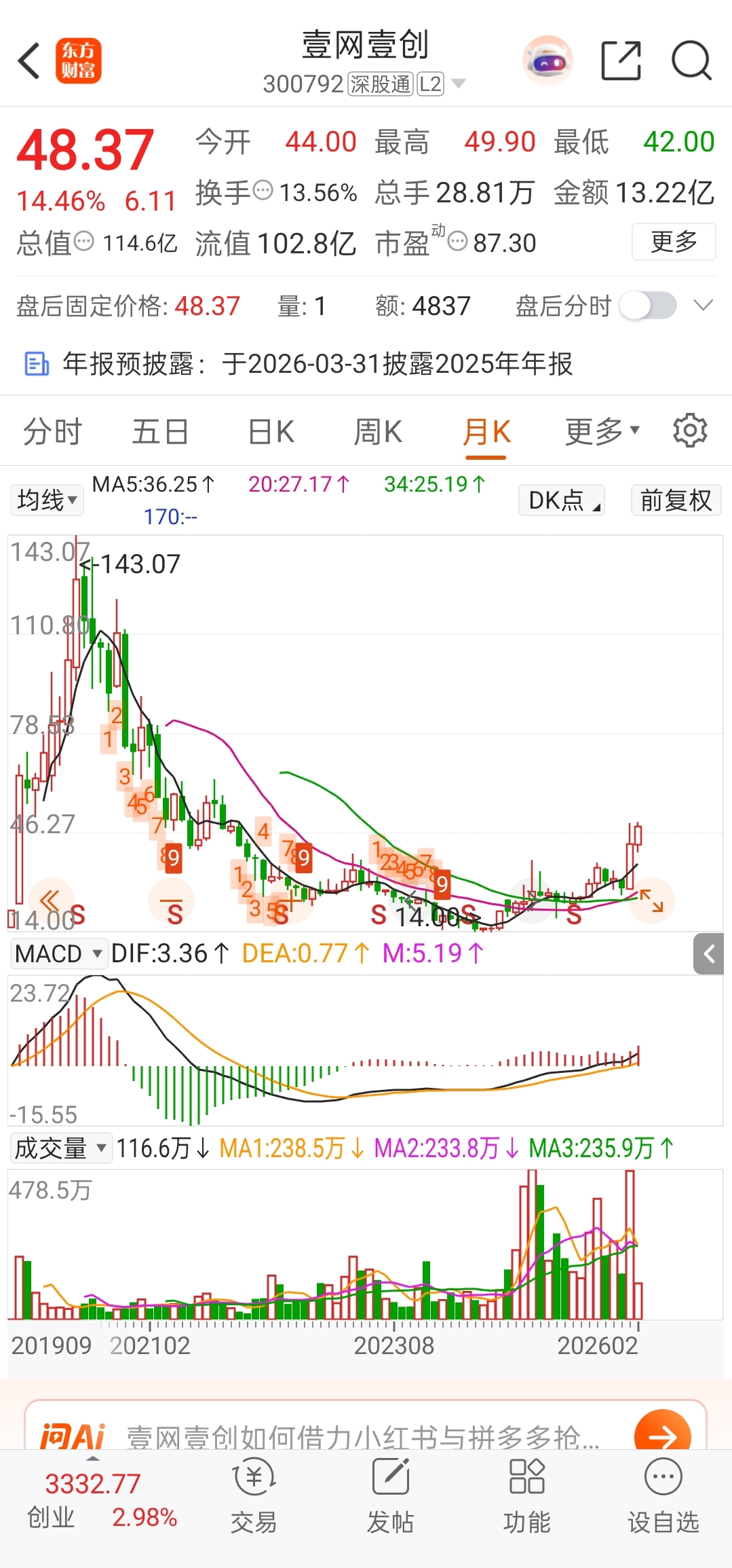 $壹网壹创(SZ300792)$ 离前面的高点还早着呢,143元!