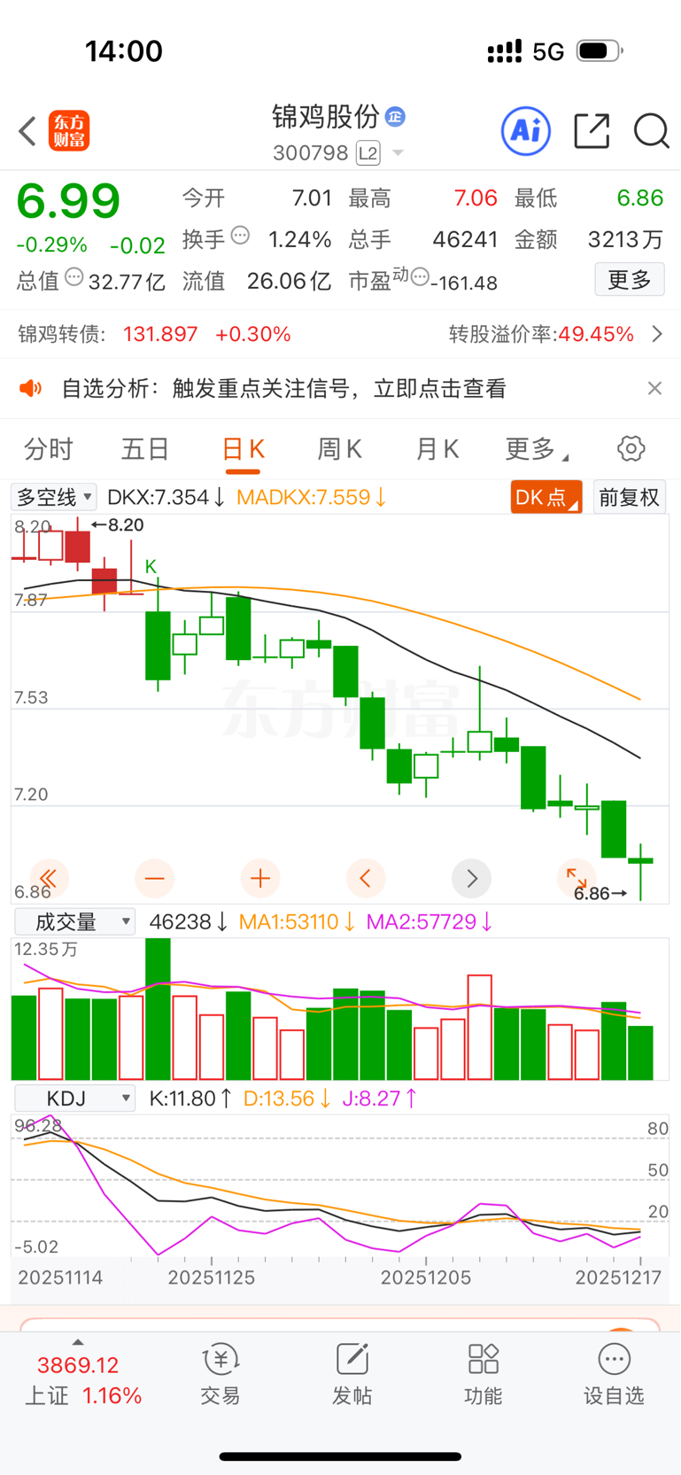 $锦鸡股份(SZ300798)$ 不和趋势作对,不要抢反弹