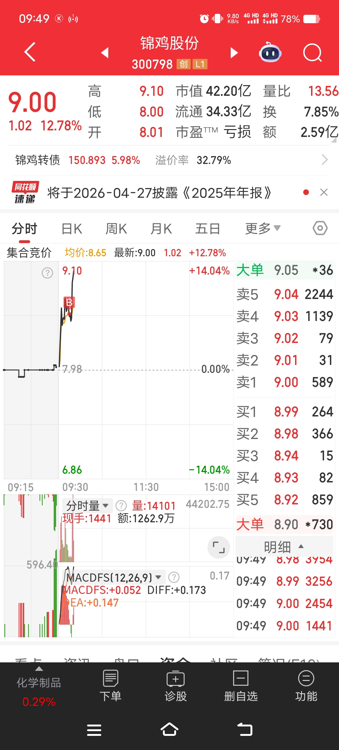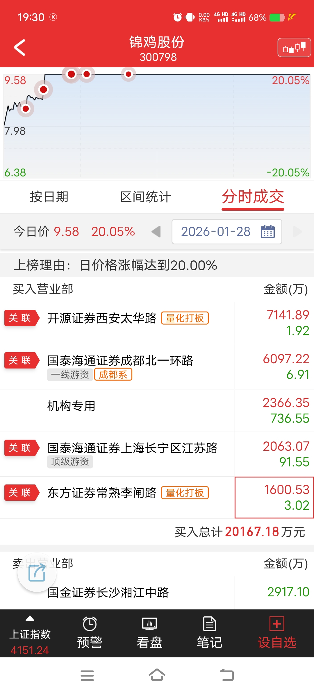$锦鸡股份(SZ300798)$今天这个榜其实挺不错的,有量化,有游资,有章盟主,不像以前只有量化,说明这股可能真有点东西,不过还得看明天市场情况,不能纯幻想,最早拉起来的量化就是这个李闸路,虽然体量不大,但却敢开第一枪,没有他就没有后面游资量化的抢筹,也是帮我脱离成本区的一个量化,这个名字我记住了,我的买点也仅比他早两分钟而已,当初我是用二档买入,我看有人抢筹急了点,没用固定价格,后面还回调了一毛多,然后被这个李闸路三百万拉起来。