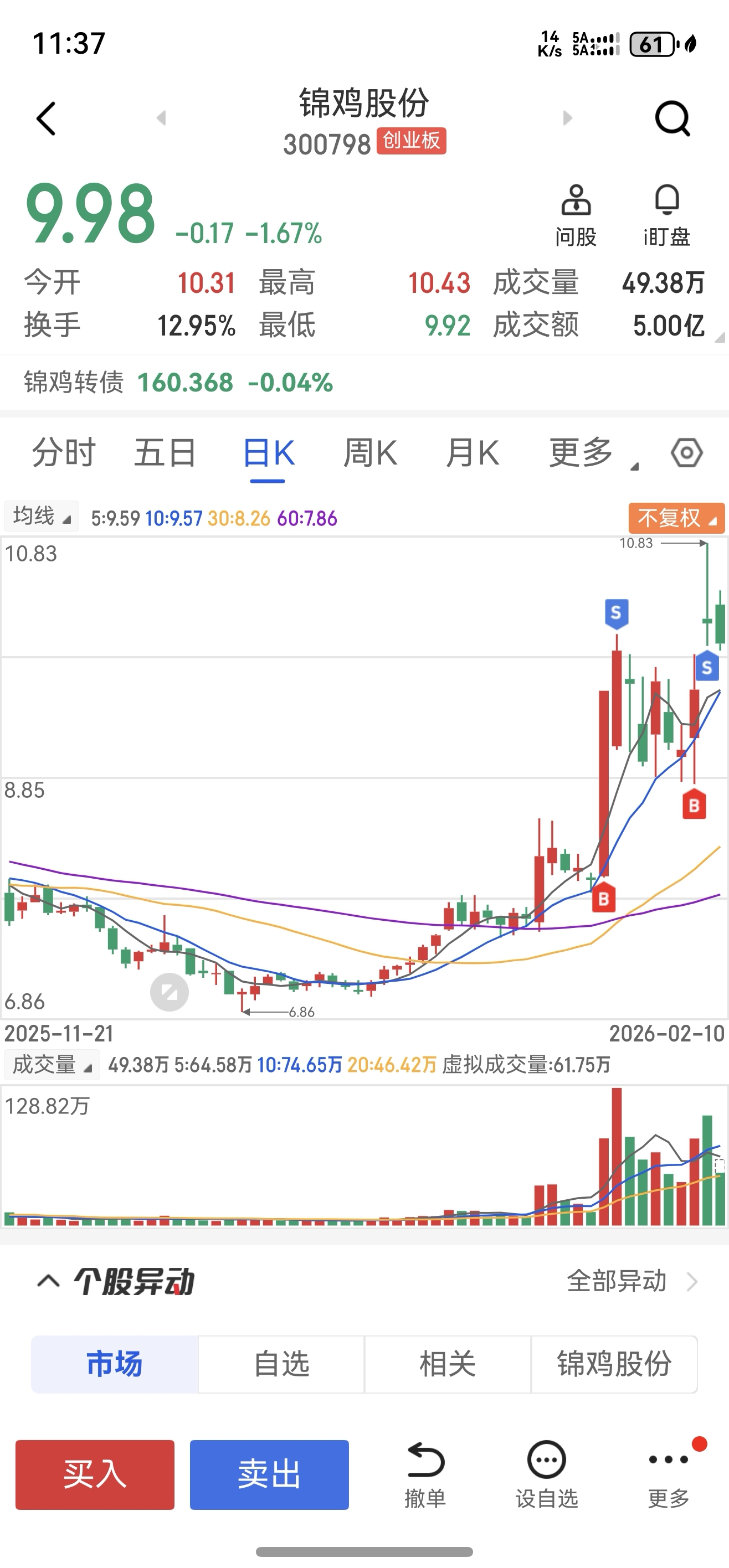 $锦鸡股份(SZ300798)$ 好在昨天卖了
