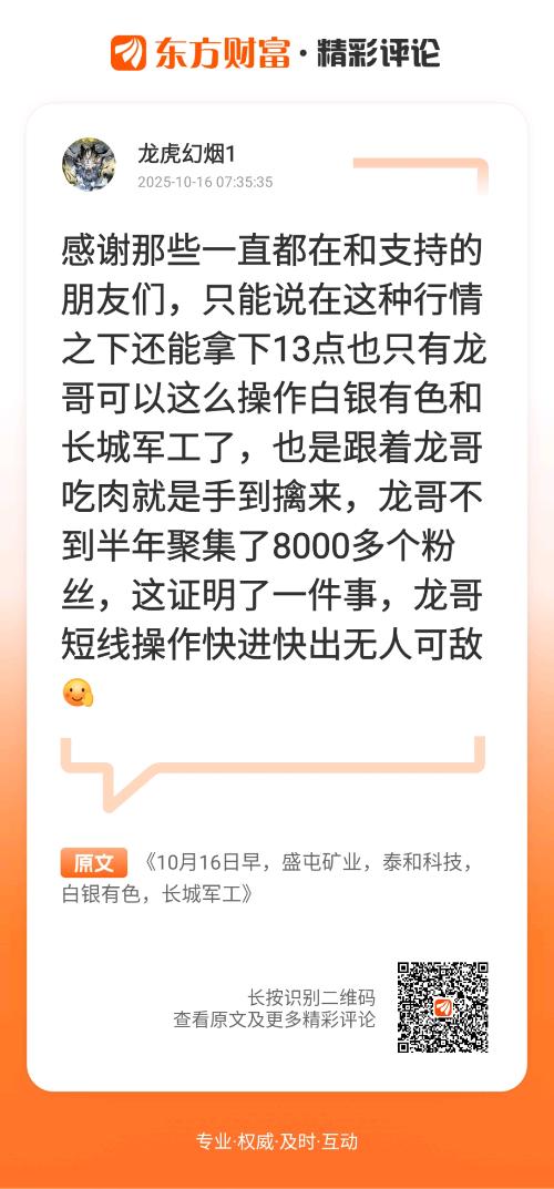 聚焦产业景气度,选的票长期逻辑都很硬 //@龙虎幻烟1 :感谢那些一直都在和支持的朋友们,只能说在这种行情之下还能拿下13点也只有龙哥可以这么操作白银有色和长城军工了,也是跟着龙哥吃肉就是手到擒来,龙哥不到半年聚集了8000多个粉丝,这证明了一件事,龙哥短线操作快进快出无人可敌 $泰和科技(SZ300801)$$合锻智能(SH603011)$$长城军工(SH601606)$