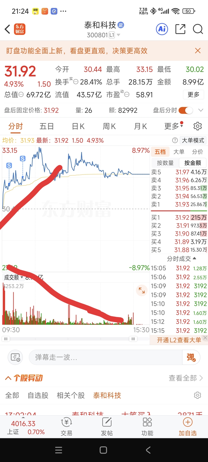 $泰和科技(SZ300801)$ 缩量上涨,,低位卖了也不后悔