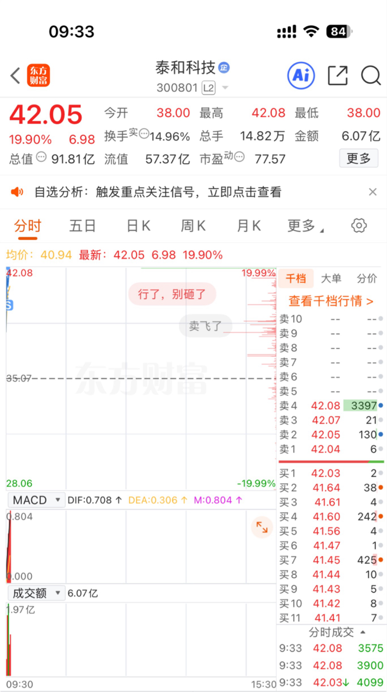 $泰和科技(SZ300801)$ 卖在高点,祝兄弟们后面继续发财