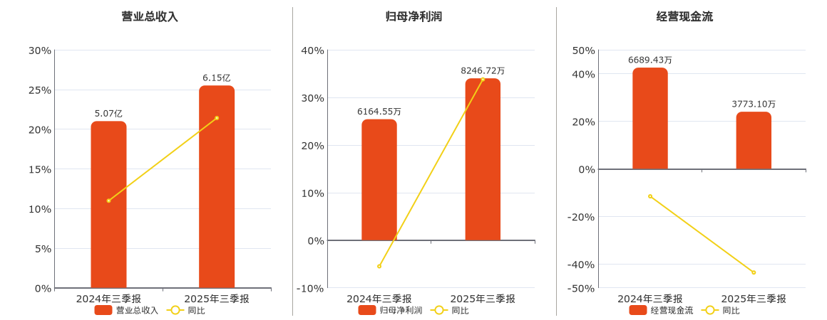 公司营业总收入为6.15亿元。归母净利润为8246.72万元。经营活动现金净流入为3773.10万元,较去年同报告期经营活动现金净流入减少2916.32万元,同比较去年同期下降43.60%。