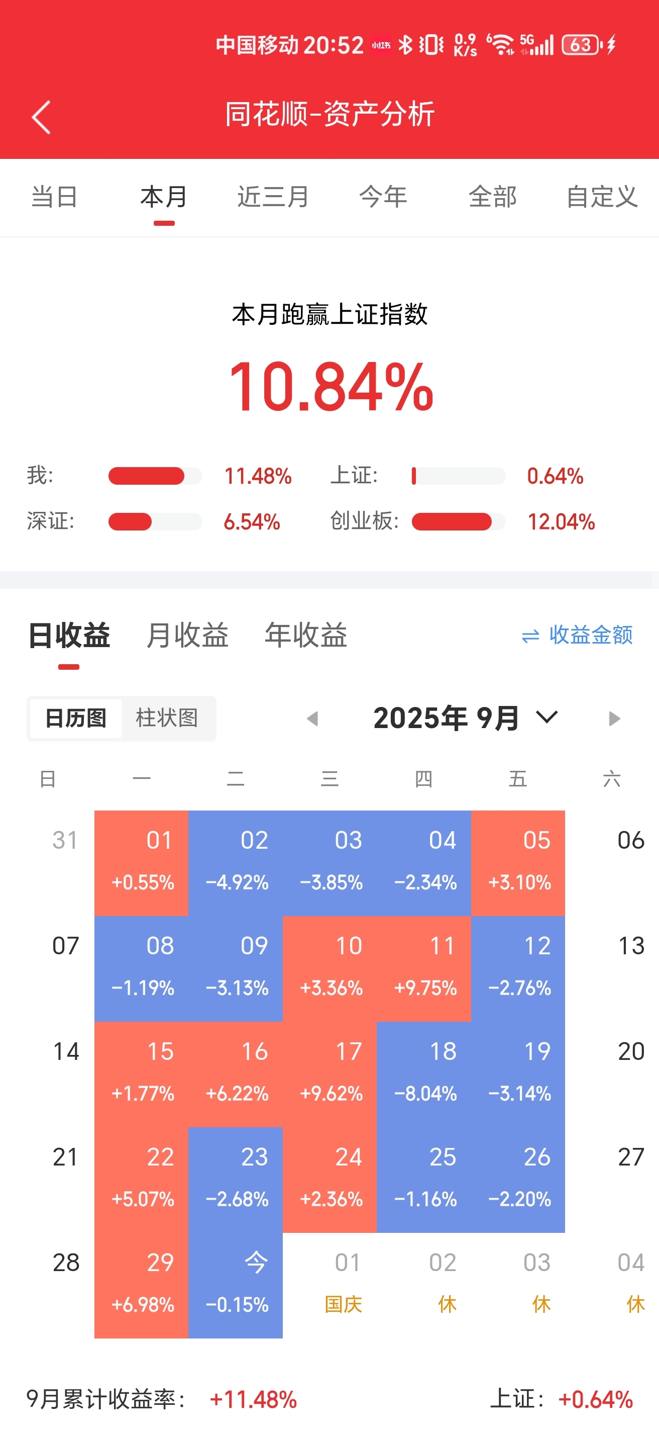 9月总体马马虎虎吧,有盈利就是胜利,期待十月开门红,继续努力加油。也祝股吧老友和