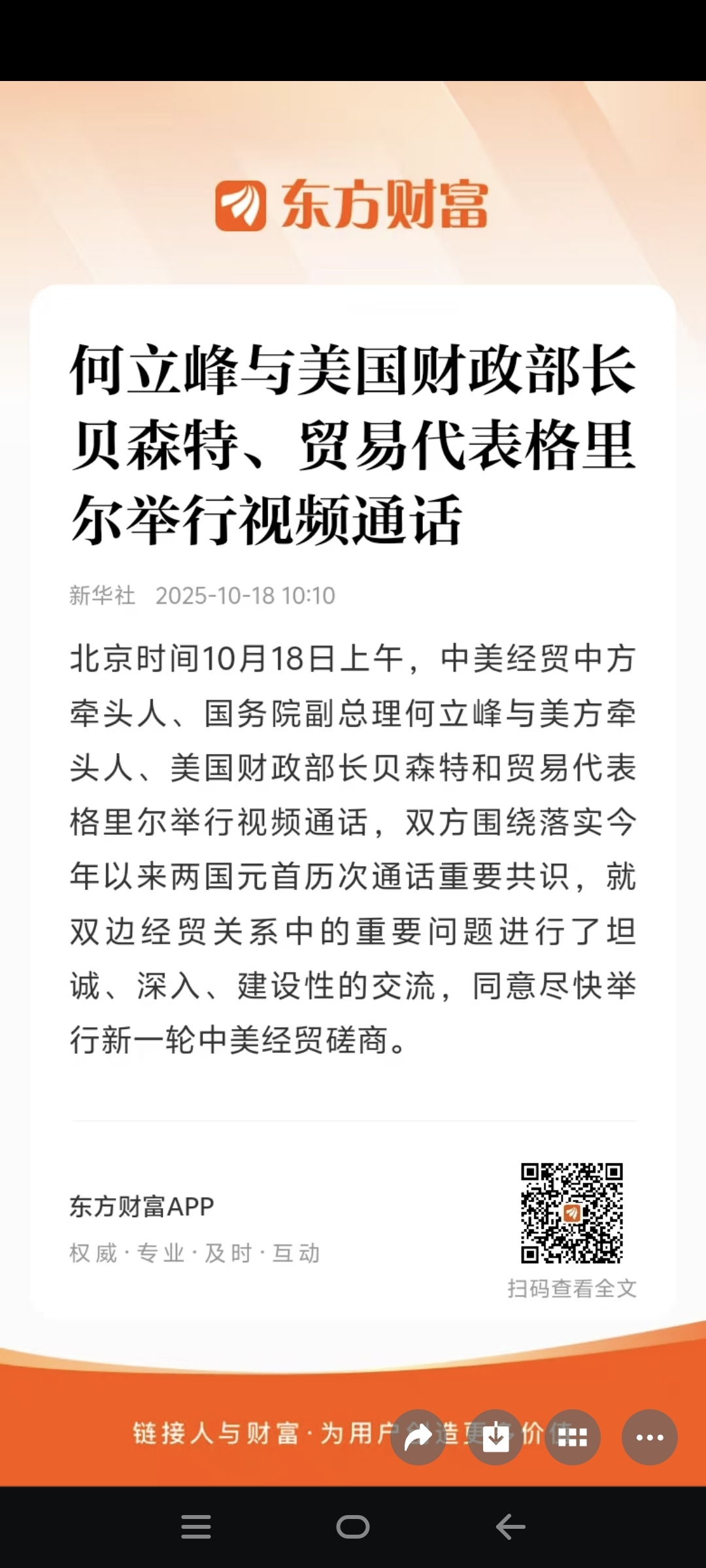 与美国财政部长贝森特、贸易代表格里尔举行视频通话!