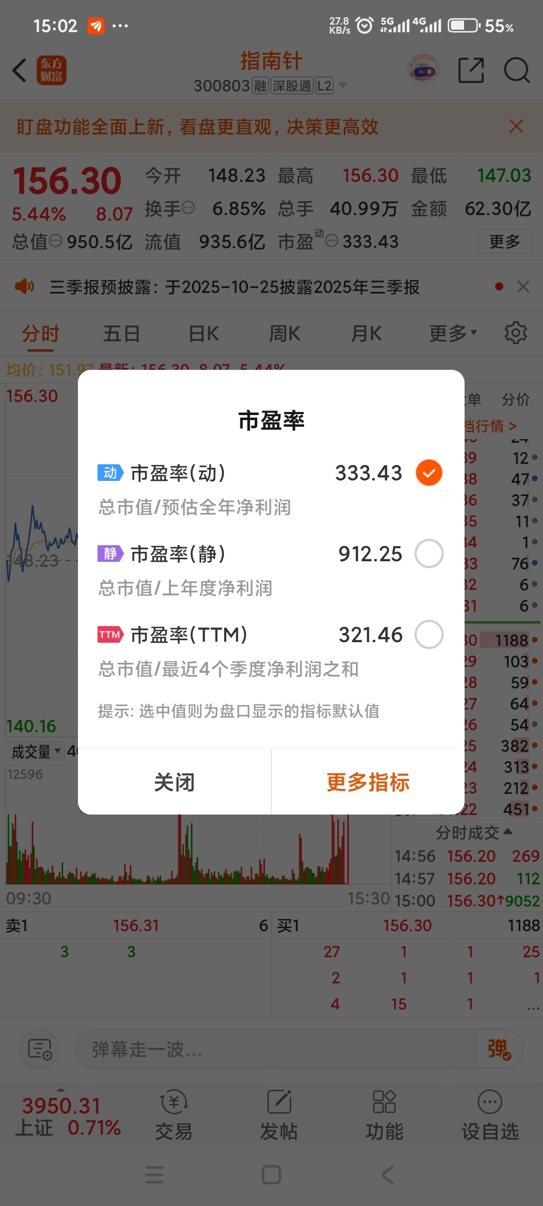 $指南针(SZ300803)$ 市盈率从300多降到200多,相比去年三季度亏损减少。看主力怎么看咯,主力觉得好才是真的好