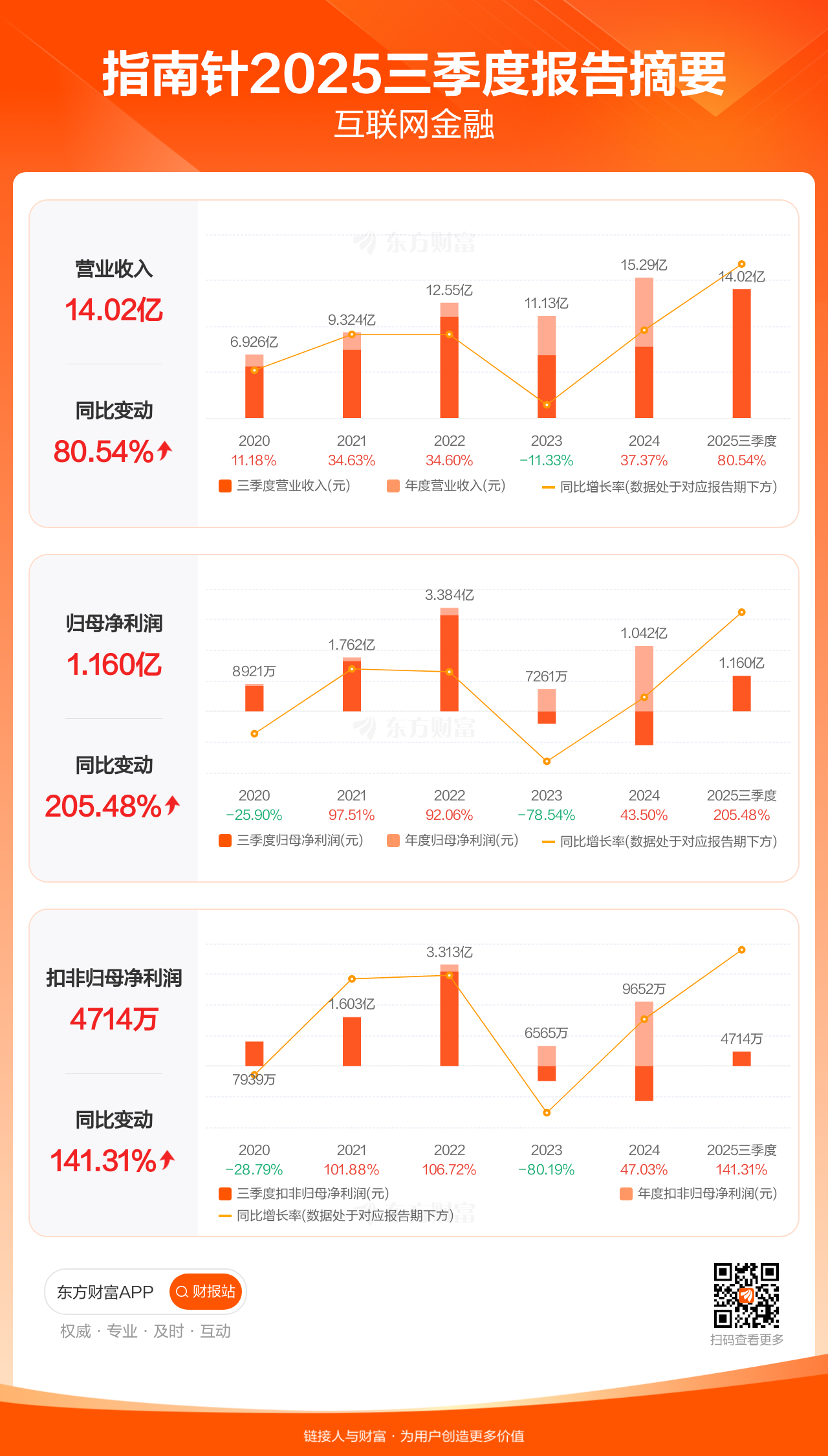 指南针10月25日发布2025年三季报显示,公司前三季实现营业收入14.02亿元,同比增长80.54%;归母净利润1.16亿元,同比增长205.48%;扣非归母净利润4713.82万元,同比增长141.31%