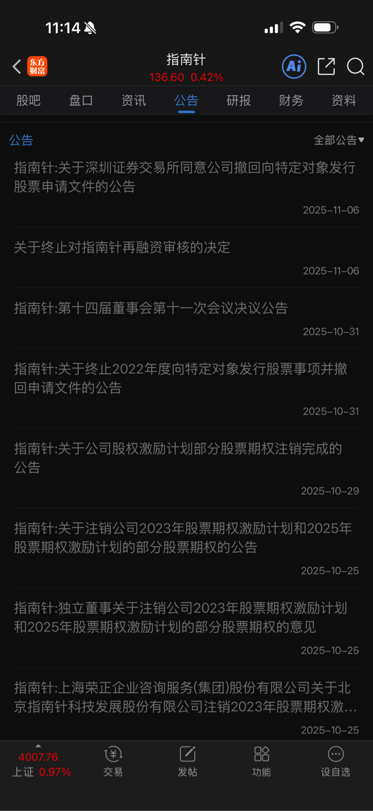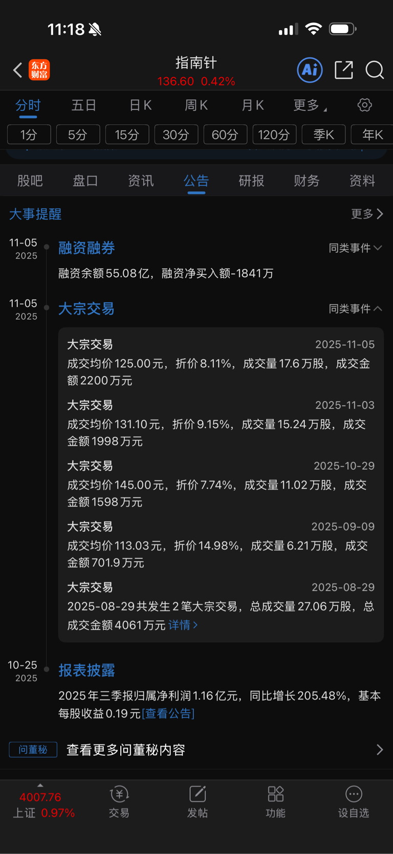 $指南针(SZ300803)$ 停止增发从上个月开始发这个新闻,横跨一个月了,这周换个标题继续发,你想证明什么?伴随这个两个月不断的折价小宗交易(交易成交额,还没王思聪随手买个买菜车钱多 ,这几个账户是有多穷?)你又想证明什么?阴跌一个月,跌去20%,so?你到底要证明什么?要st就抓紧,别搞这些小打小闹的东西!