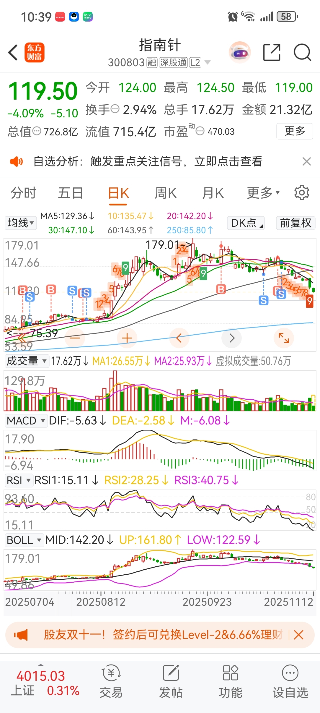 $指南针(SZ300803)$ 160近的,140割的,不割又掉了20元,太可怕了。不要持有下跌趋势的股。就像从北京去哈尔滨,你往南走,越努力,离目标越远。