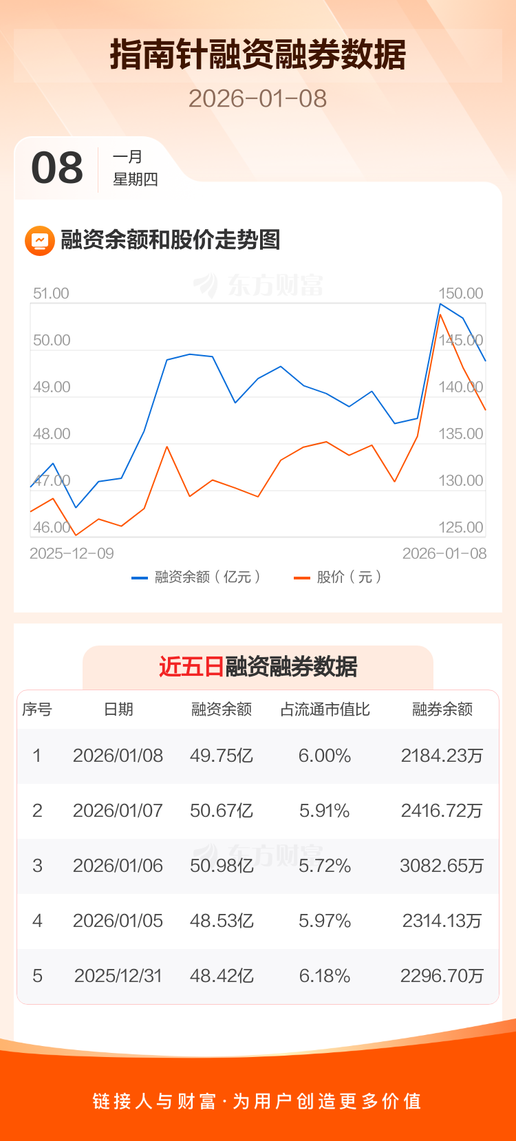 交易所最新数据显示,指南针于2026年1月8日获融资买入6.41亿元,融资偿还7.33亿元,当日融资净偿还9149.19万元。目前,该股融资余额49.75亿,占流通市值比例为6.00%。