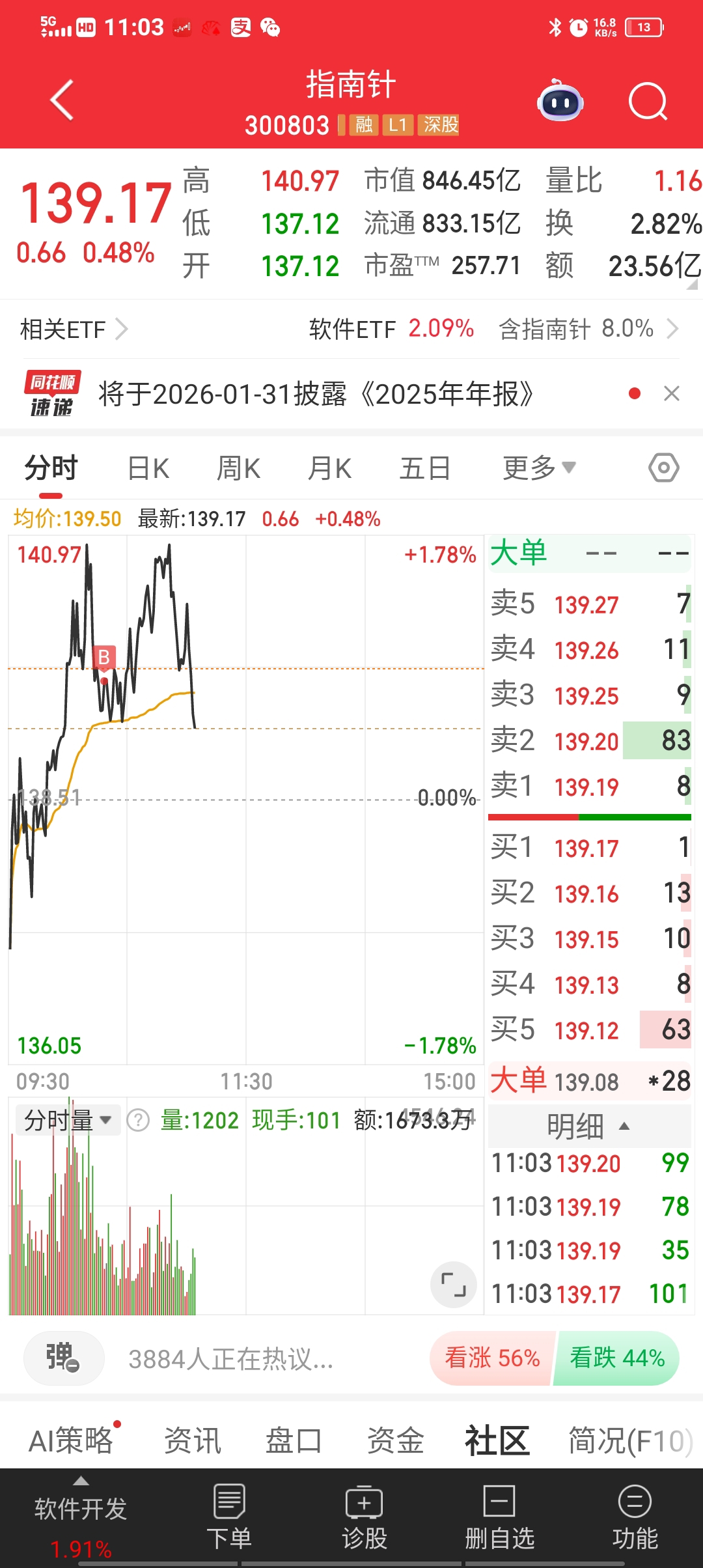 $指南针(SZ300803)$ 昨天早盘有15万剩余资金,没换巨力索具,拍大腿,看好了,犹豫买别的了。今天追高买了你,严重失误,还好只有一手。