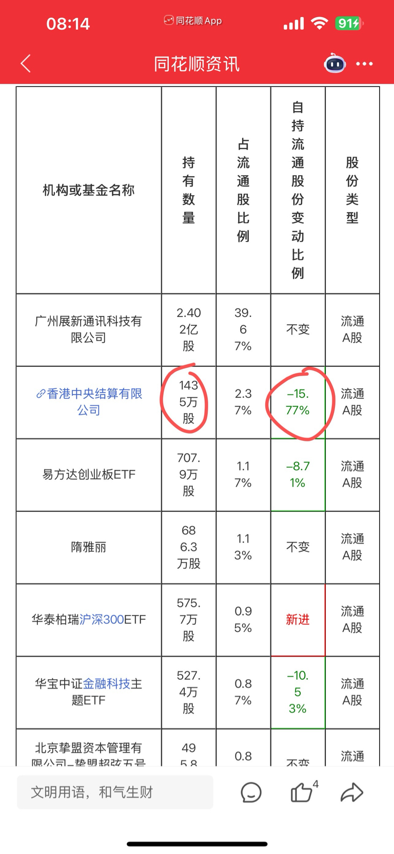 $指南针(SZ300803)$ 香港中央结算有限公司本期较上期自持股份减少15.77%至1435万股,难怪一直跌跌不休