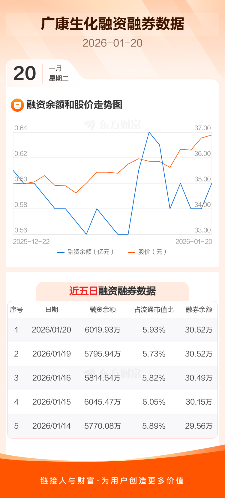 交易所最新数据显示,广康生化于2026年1月20日获融资买入506.35万元,融资偿还282.36万元,当日融资净买入223.99万元。目前,该股融资余额6019.93万,占流通市值比例为5.93%。