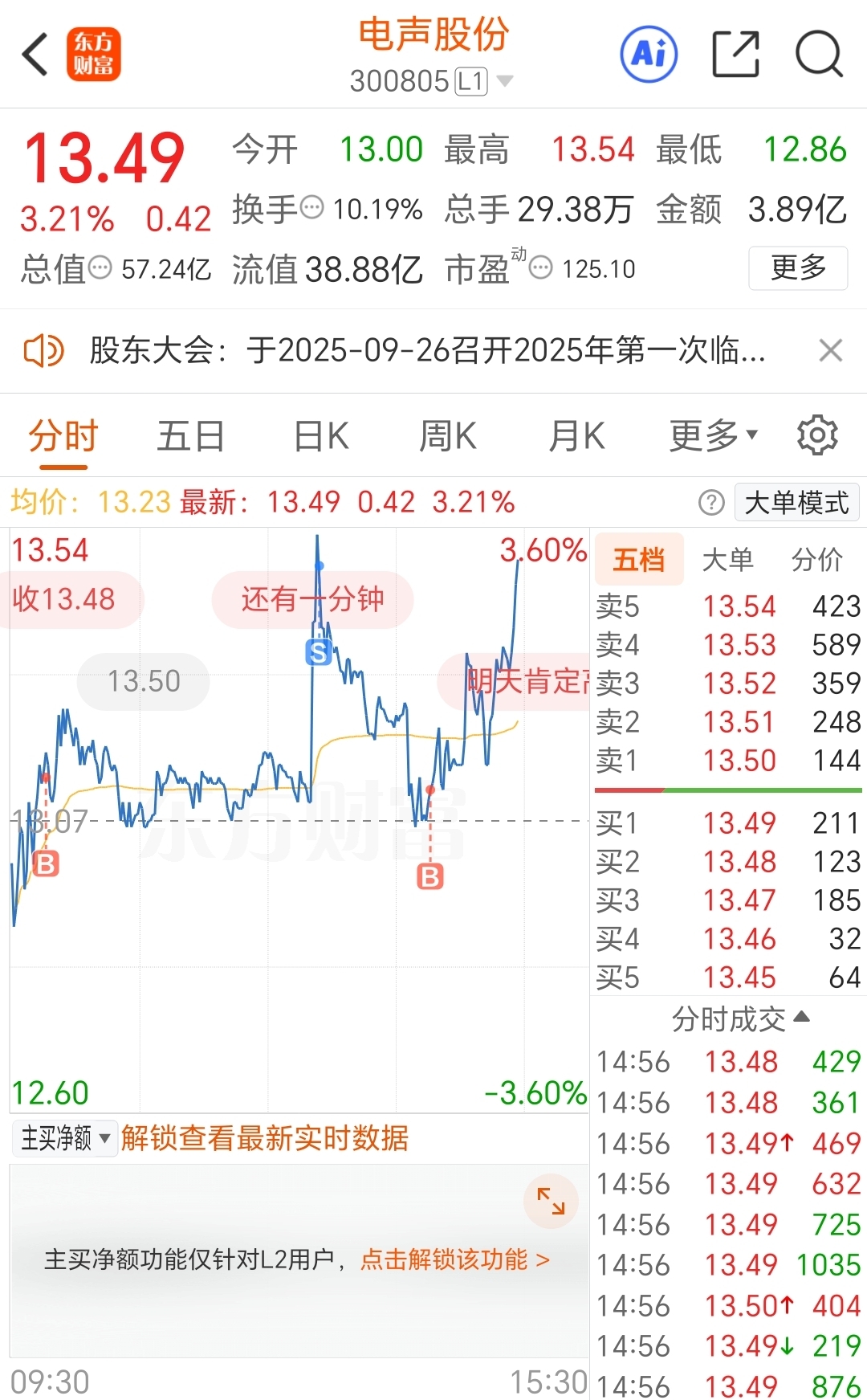$电声股份(SZ300805)$ 今天的表现可谓是精彩绝伦
