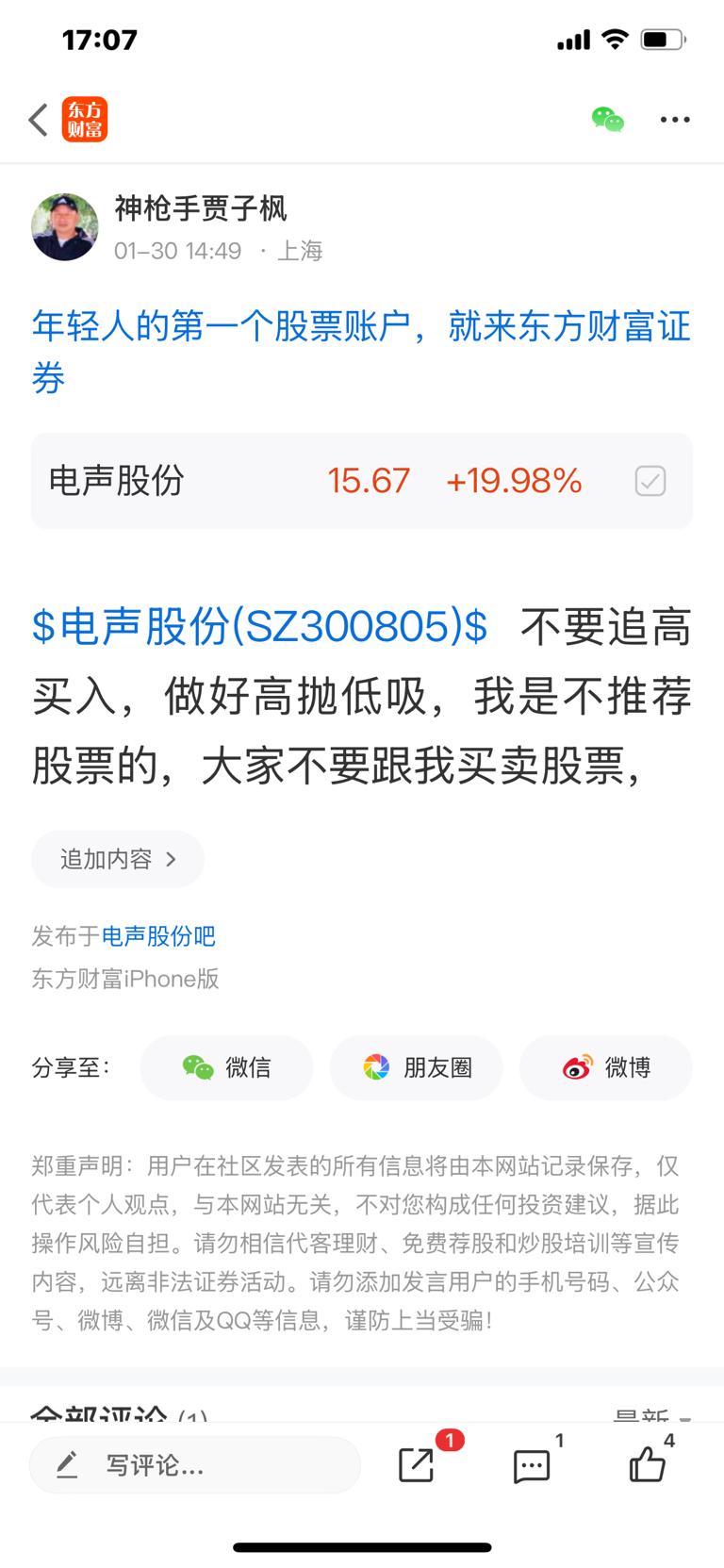 温馨提示: 1.根据《证券法》规定,禁止编造、传播虚假信息或者误导性信息,扰乱证券市场;2.用户在本社区发表的所有资料、言论等仅代表个人观点,与本网站立场无关,不对您构成任何投资建议。用户应基于自己的独立判断,自行决定证券投资并承担相应风险。《东方财富社区管理规定》