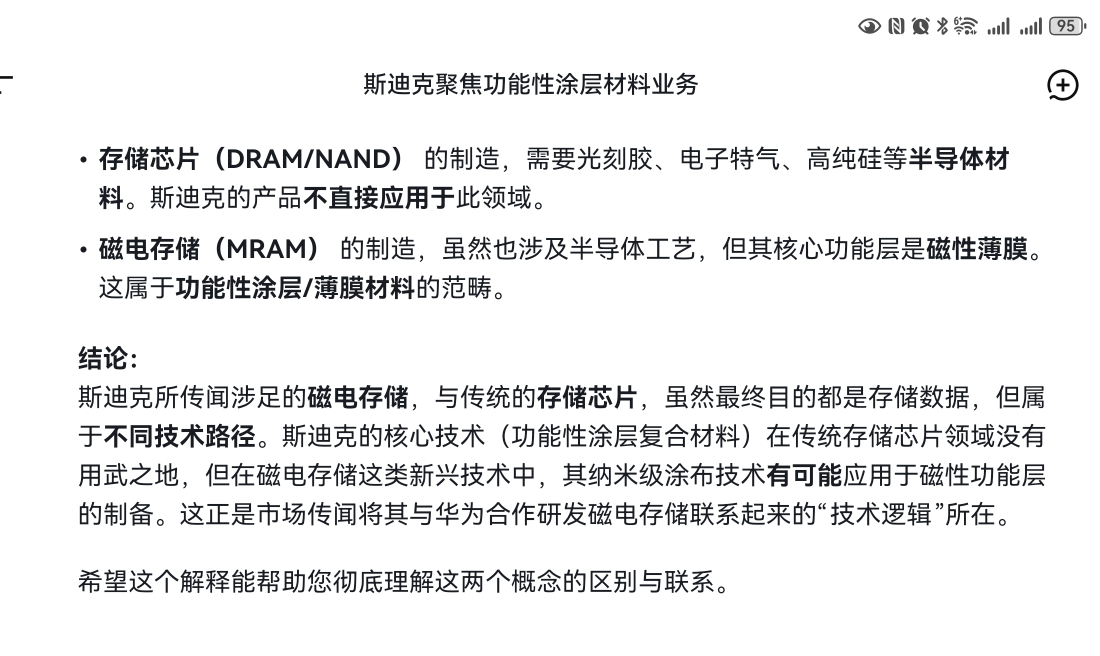 $斯迪克(SZ300806)$ 磁电存储和存储芯片是同类(都属于数据存储介质),但它们是完全不同代际、不同工作原理的技术。