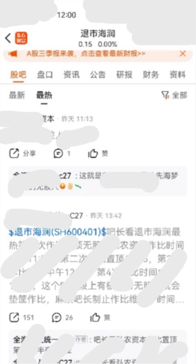 吧长看退市海润和海润1大量作比行为需要重视,退市最热无股人弘农资本,半夜12点的
