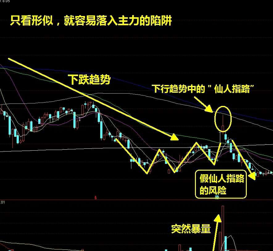 规避原则:下跌趋势中出现的“仙人指路”一律规避,技术形态的有效性必须建立在上升趋势或底部反转结构之上;
