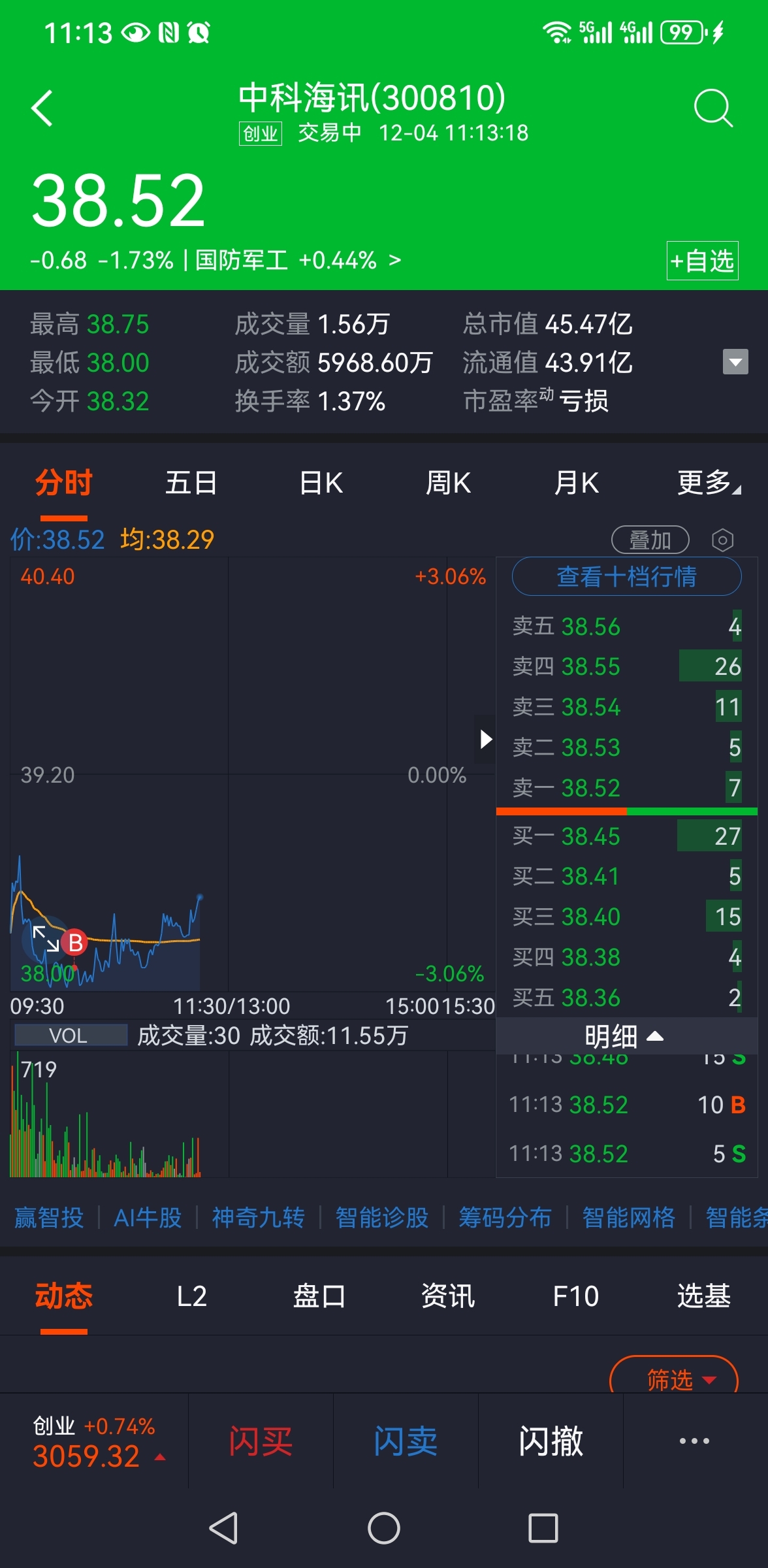 $中科海讯(SZ300810)$ 每天搞个饭钱,38.52卖出