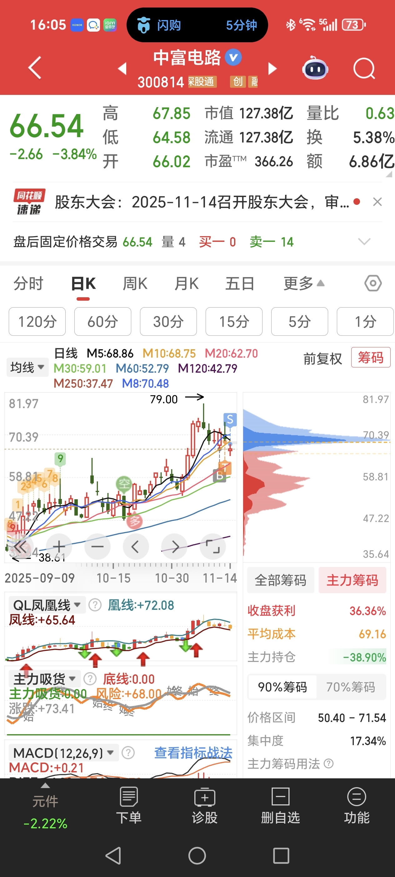 $中富电路(SZ300814)$ 中富今天67减了一些,下周再看了,看主力筹码其实也在上方套着,自行判断下