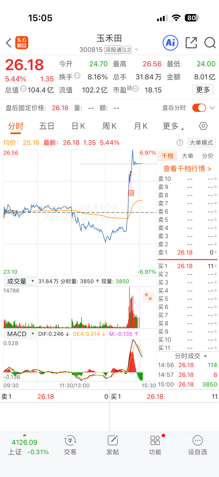 $玉禾田(SZ300815)$ #炒股日记# 20260114 继续尾盘买入。大盘成交额近4万亿,太吓人了。买创业板较合算,毕竟涨跌幅度大。而科创及北证因资金要求50 w以上,相对小散没法参加。