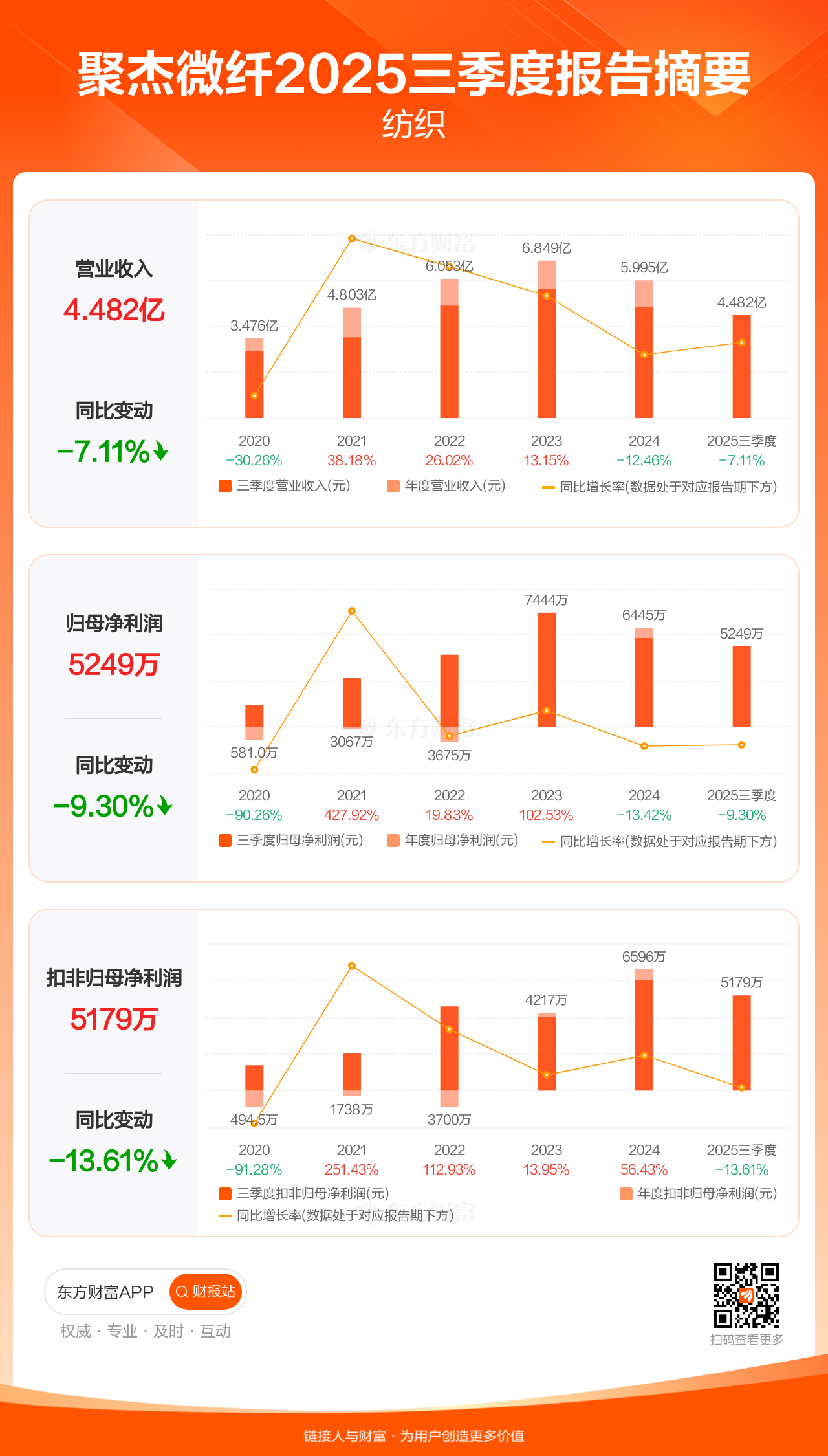 聚杰微纤10月30日发布2025年三季报显示,公司前三季实现营业收入4.48亿元,同比下滑7.11%;归母净利润5248.91万元,同比下滑9.30%;扣非归母净利润5178.68万元,同比下滑13.61%。
