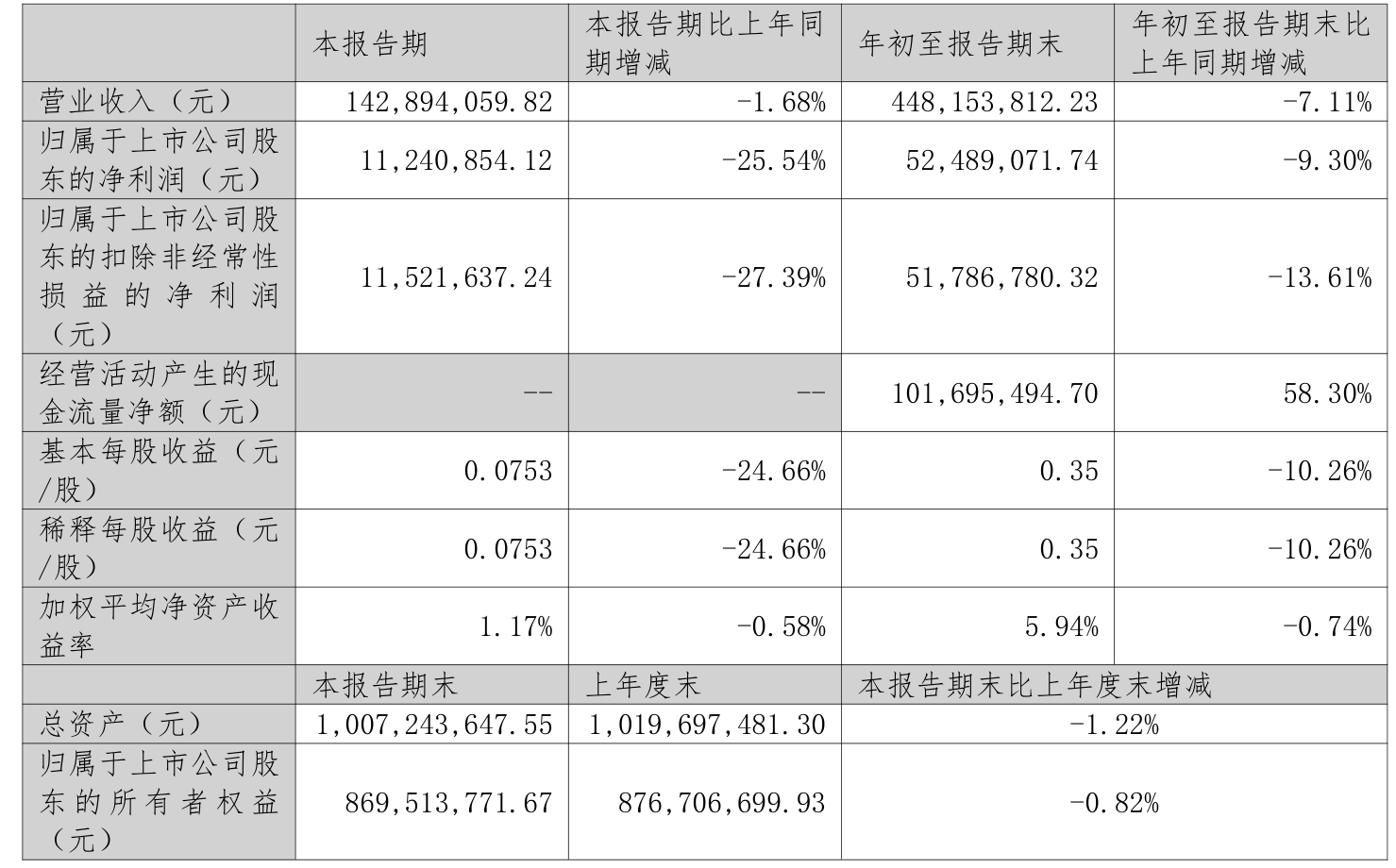 中证智能财讯聚杰微纤(300819)10月30日披露2025年第三季度报告。前三季度公司实现营业总收入4.48亿元,同比下降7.11%;归母净利润5248.91万元,同比下降9.30%;扣非净利润5178.68万元,同比下降13.61%;经营活动产生的现金流量净额为1.02亿元,同比增长58.30%;报告期内,聚杰微纤基本每股收益为0.35元,加权平均净资产收益率为5.94%。
