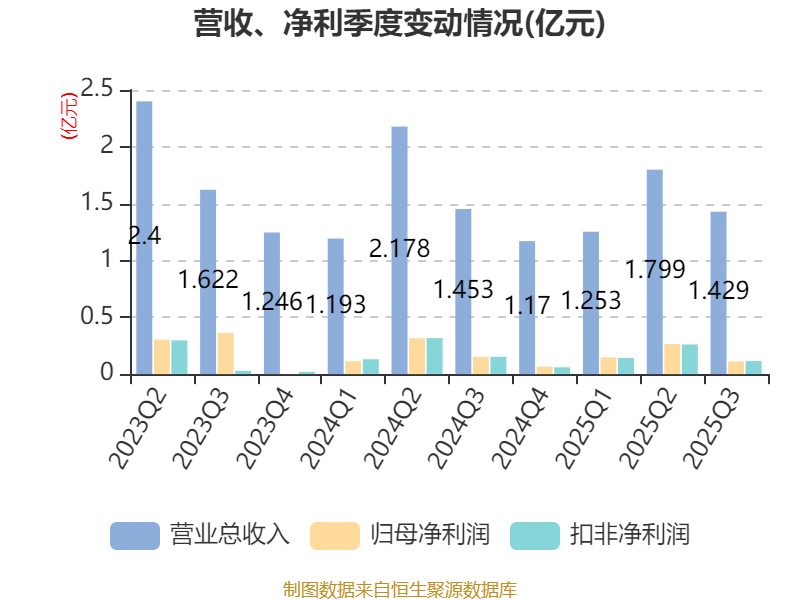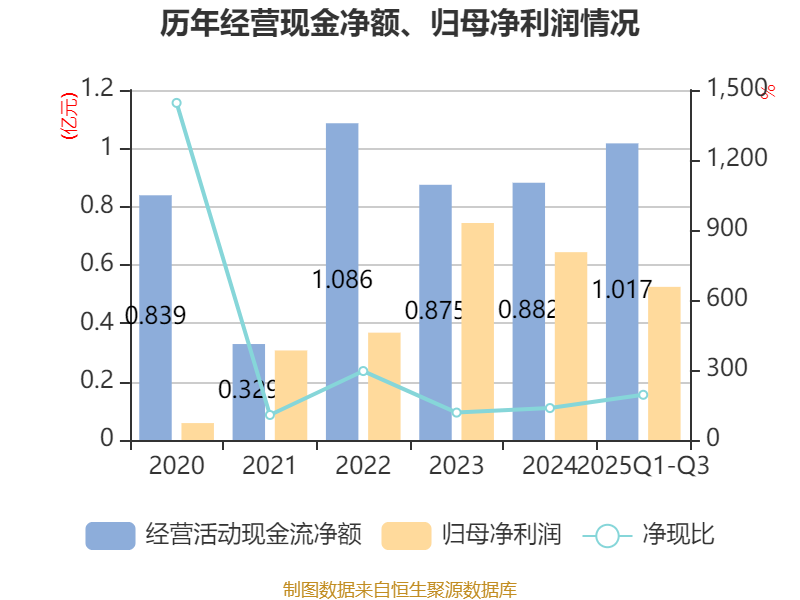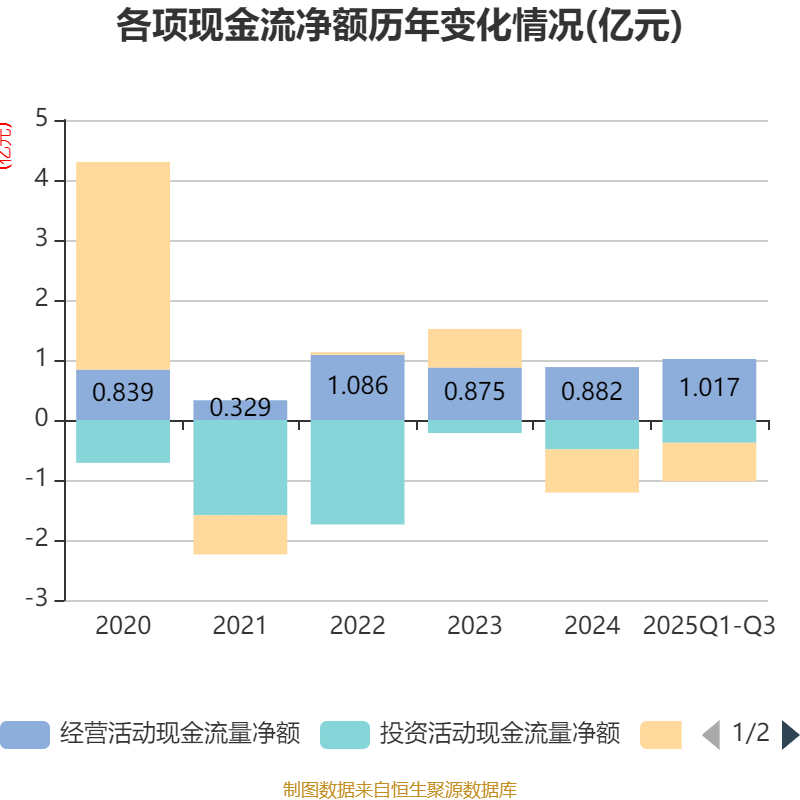 2025年前三季度,公司经营活动现金流净额为1.02亿元,同比增长58.3%;筹资活动现金流净额-6425.85万元,同比增加2257.49万元;投资活动现金流净额-3790.15万元,上年同期为991.35万元。