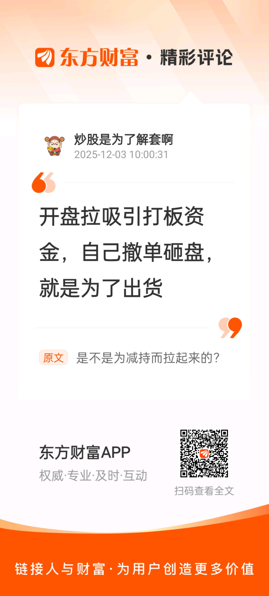 //@炒股是为了解套啊 :开盘拉吸引打板资金,自己撤单砸盘,就是为了出货