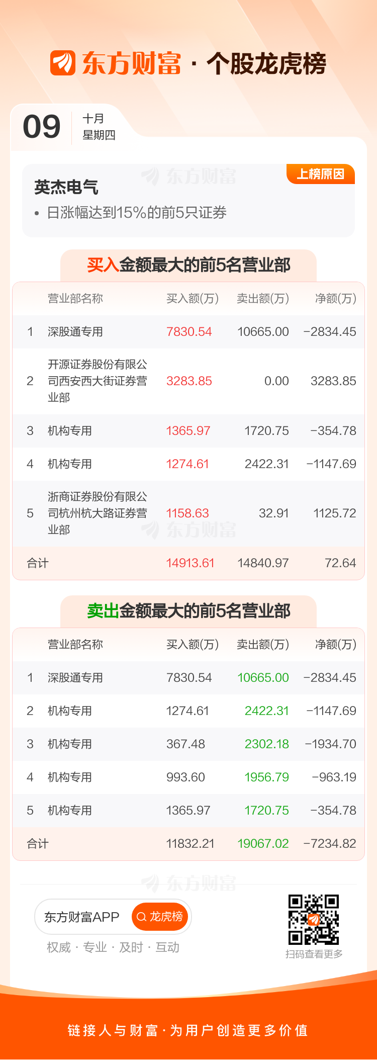 交易所2025年10月9日公布的交易公开信息显示,英杰电气因成为日涨幅达到15%的前5只证券上榜。英杰电气当日收报62.26元,涨跌幅20.01%,偏离值20.00%,换手率14.60%,成交额9.32亿。
