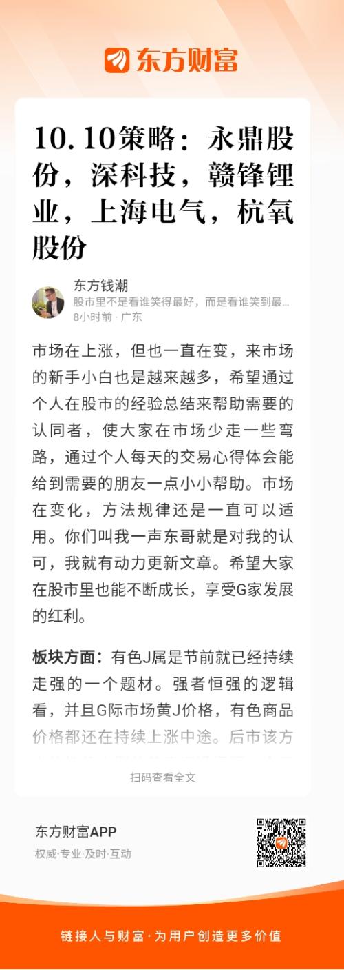 永鼎股份(600105):股价继续保持在5日均线上方运行,昨天股价强势一字涨停突破了一周时间的横盘整固阶段,具有走加速向上的预期。今天继续强势的预期,策略上,股价继续大幅高开就可以入场,要是高开幅度低于4个点,就先不要着急入场,可以看到股价在回调后出现了放量拉升再顺势切入。$永鼎股份(SH600105)$
