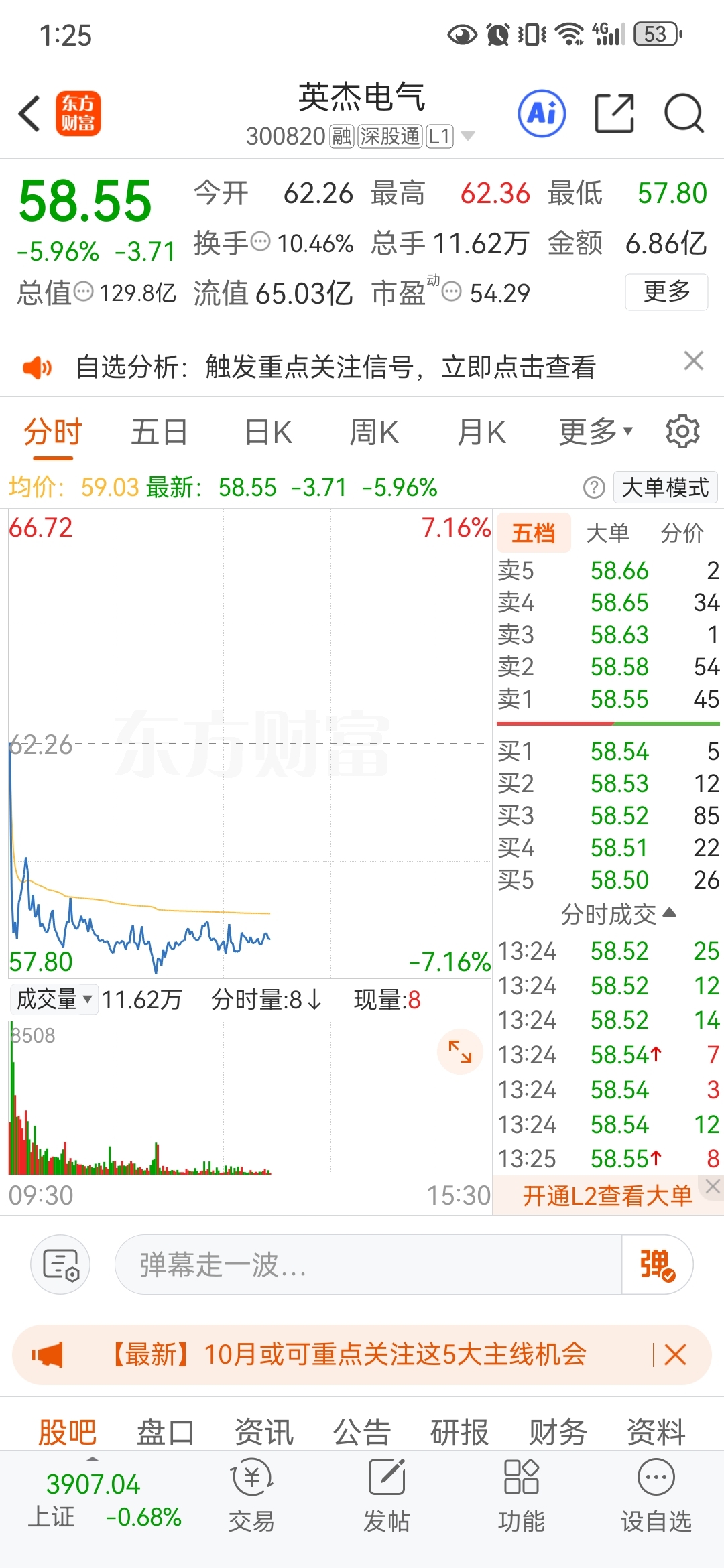 $英杰电气(SZ300820)$ 大概率收十字星,睡觉