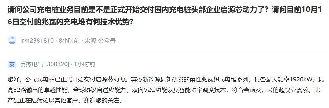 英杰电气:公司充电桩已正式开始交付启源芯动力