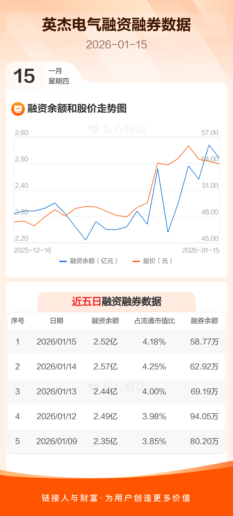交易所最新数据显示,英杰电气于2026年1月15日获融资买入2148.92万元,融资偿还2692.27万元,当日融资净偿还543.35万元。目前,该股融资余额2.52亿,占流通市值比例为4.18%。
