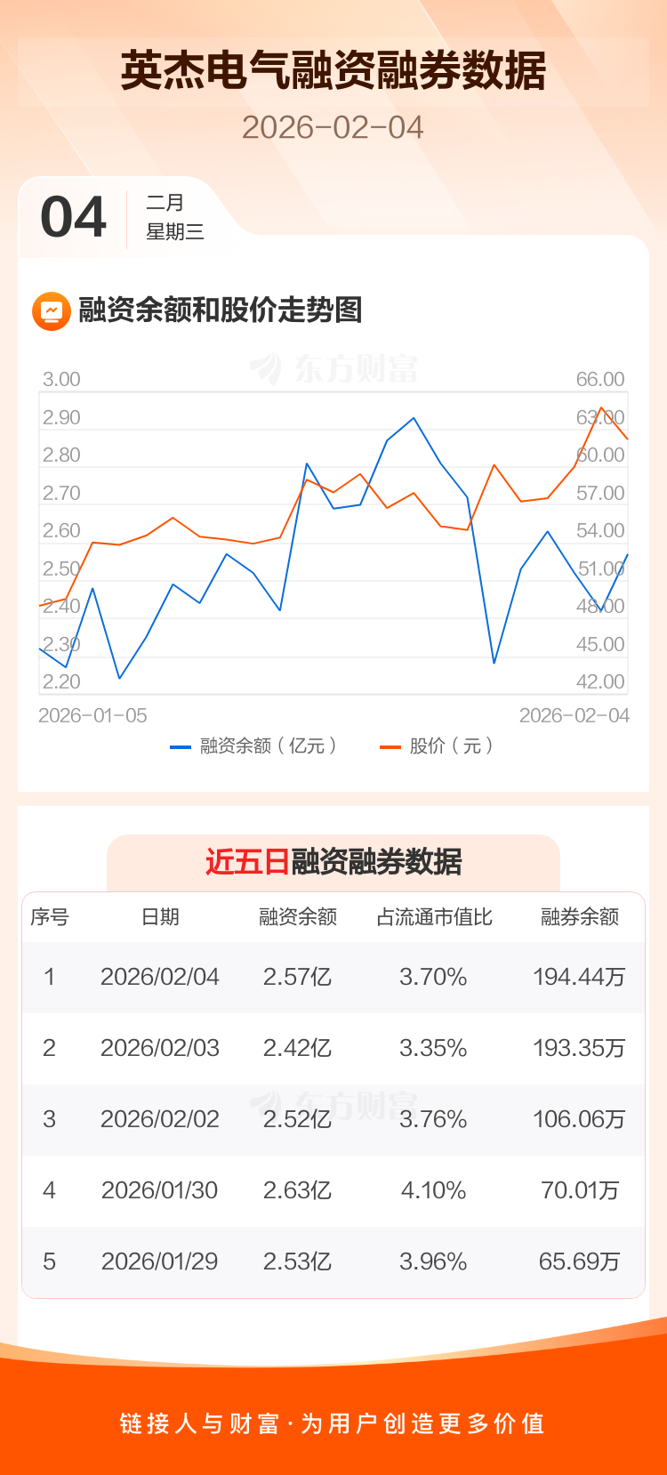 交易所最新数据显示,英杰电气于2026年2月4日获融资买入5559.87万元,融资偿还4076.83万元,当日融资净买入1483.04万元。目前,该股融资余额2.57亿,占流通市值比例为3.70%。