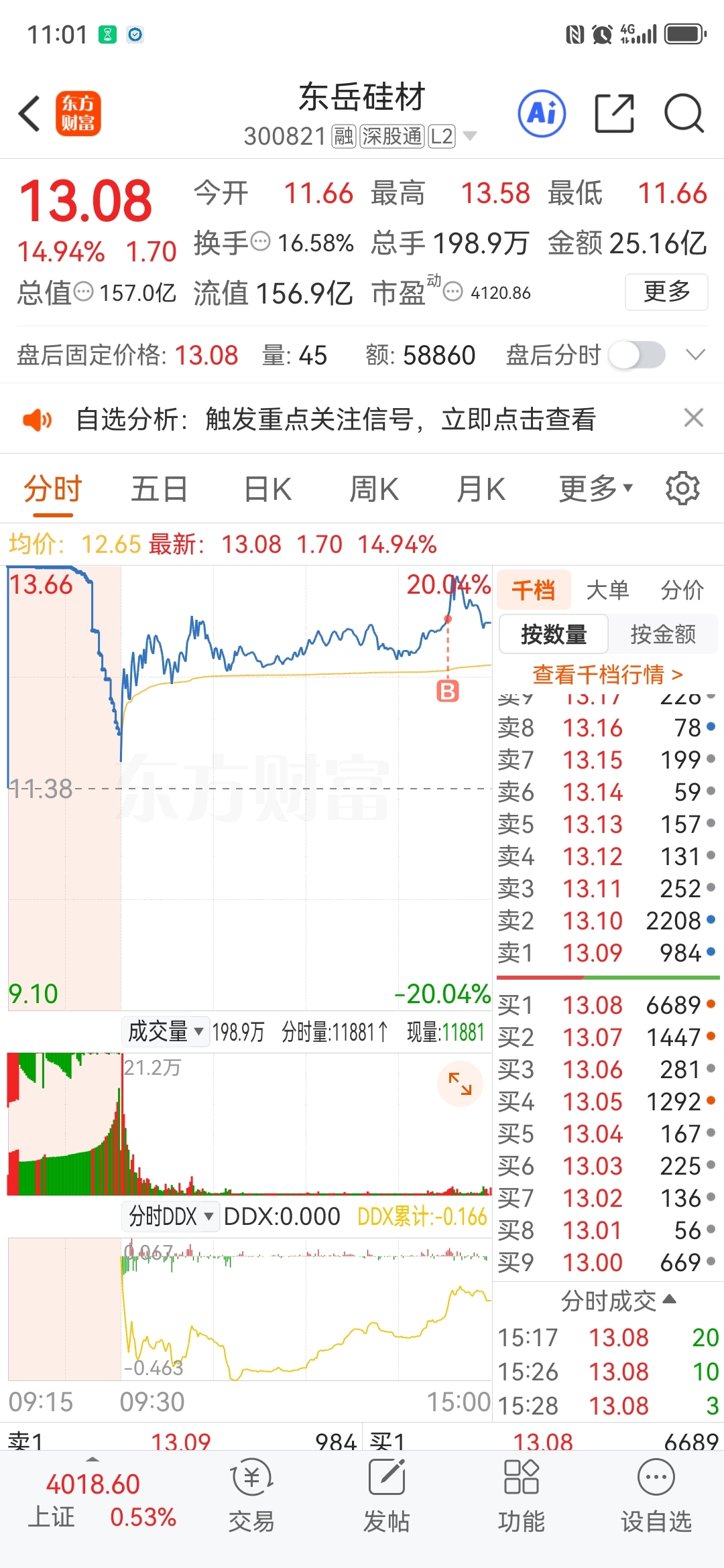 $东岳硅材(SZ300821)$ 盘我进来了,这个股早上之后全天在均线之上,尾盘怎么看都是要冲板的,可惜2:38分合富中国、平潭发展等市场情绪股开始跳水,也跟着跳水了,虽然扯不上什么关系,但是就是跟着跳水了,应该是资金看到看到市场情绪股跳水避险砸盘导致的,至于明天的事谁知道呢?走势是很不错的,长线可以拿,我是短线的,明天上午看情况决定去留。