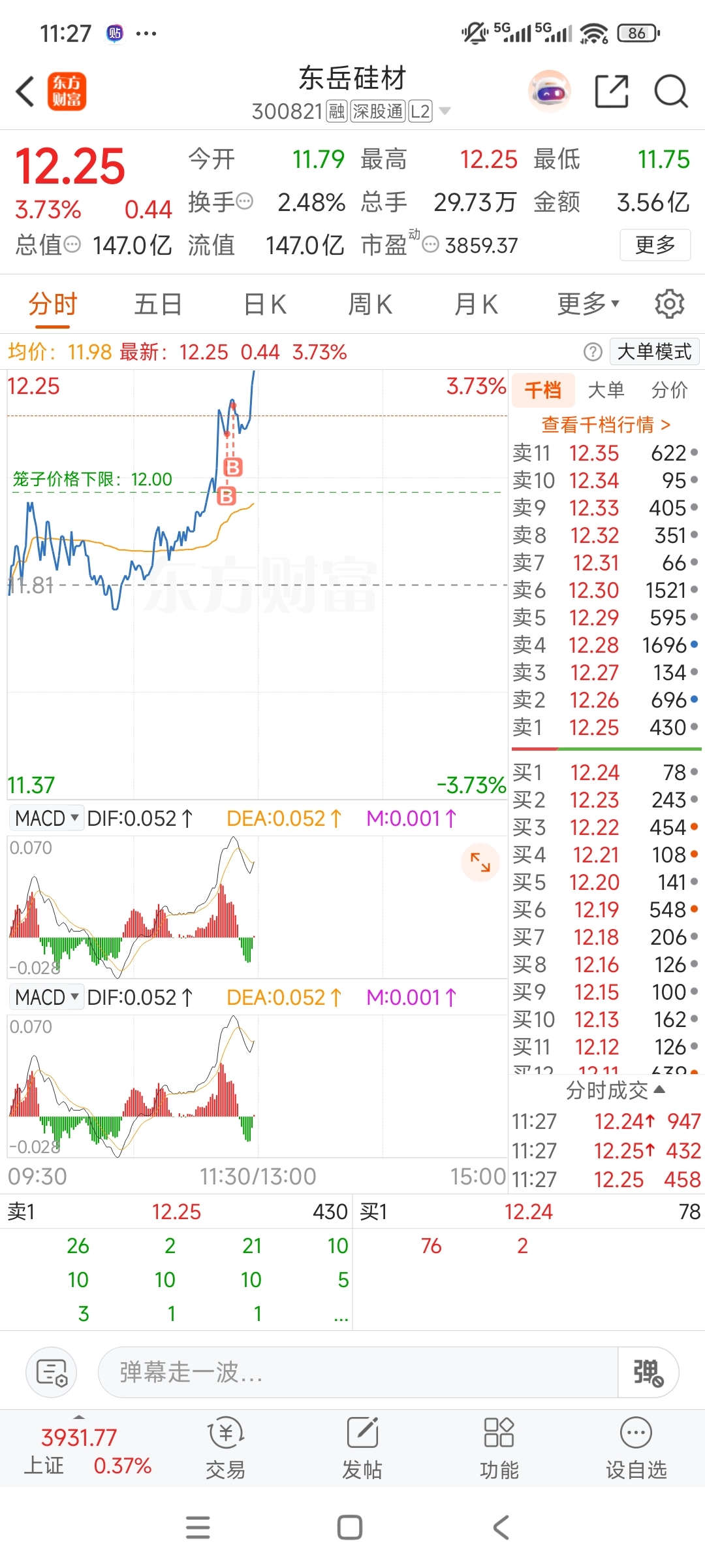 $东岳硅材(SZ300821)$ 新标的东岳硅材现在还可以追,中午收盘之前可以买。加速进场,不然没机会了。