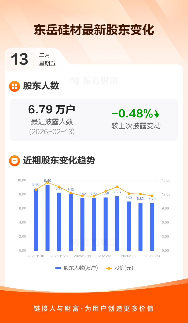 东岳硅材:截至2月13日最新股东户数6.79万户,较上期减少0.48%