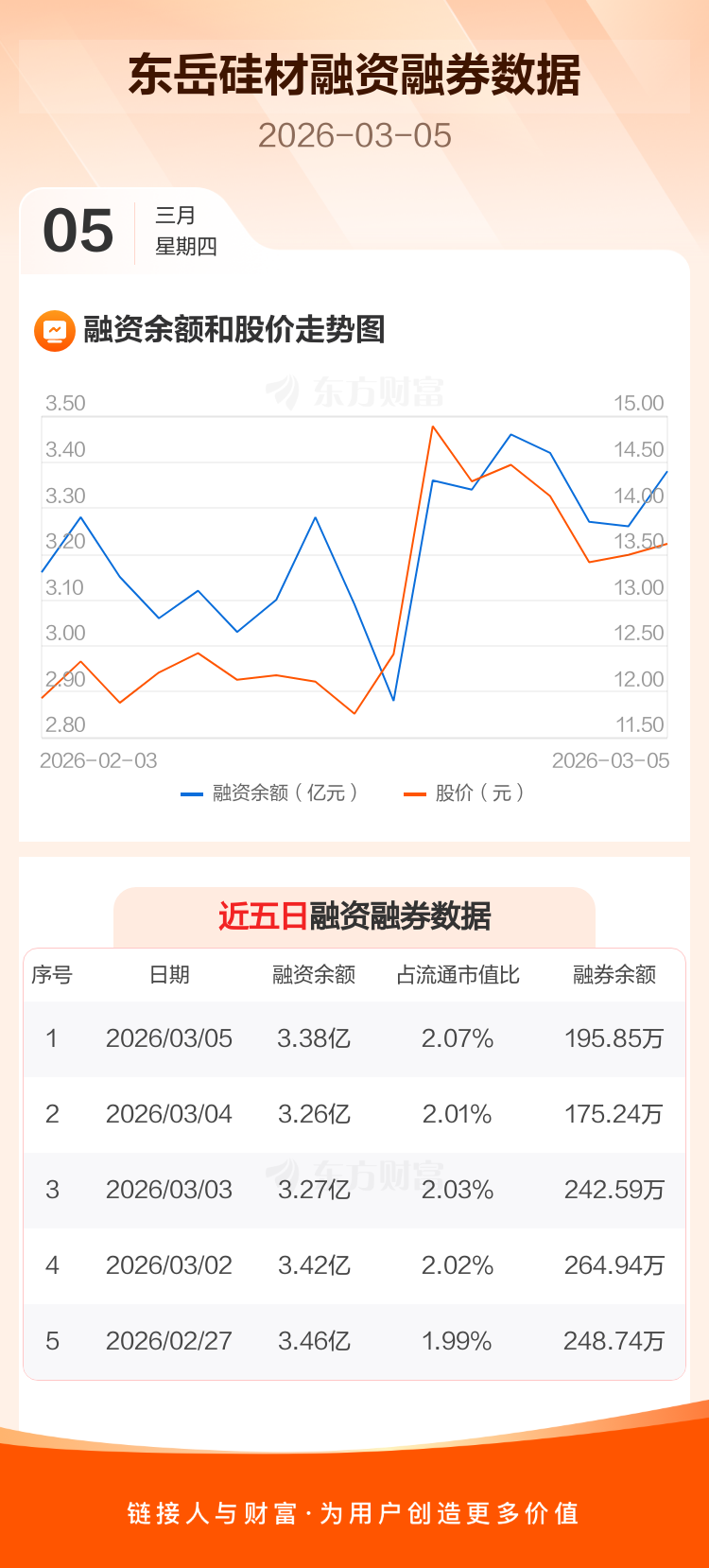 交易所最新数据显示,东岳硅材于2026年3月5日获融资买入4920.76万元,融资偿还3698.71万元,当日融资净买入1222.06万元。目前,该股融资余额3.38亿,占流通市值比例为2.07%。