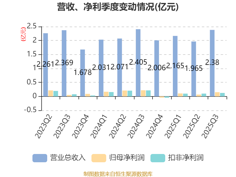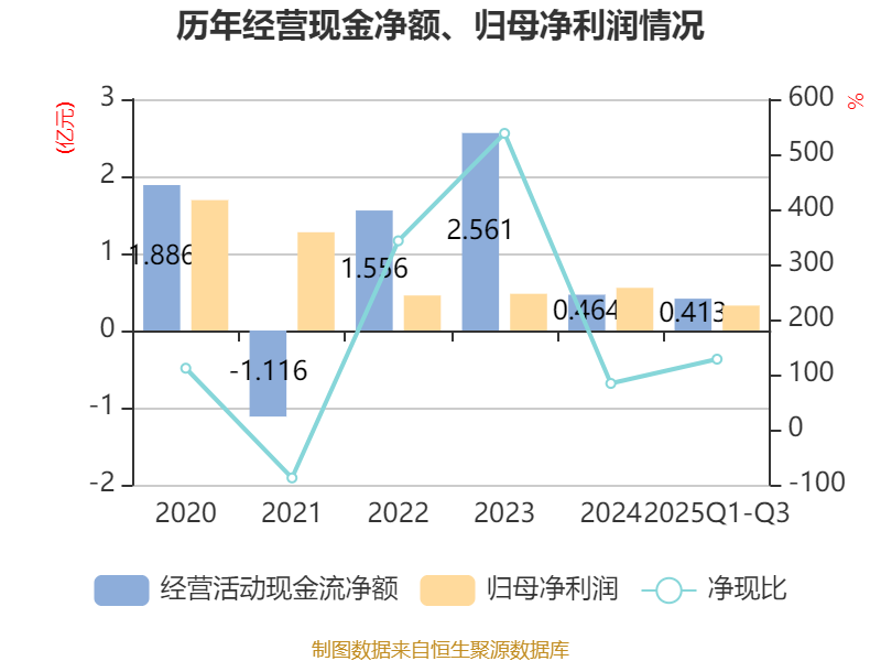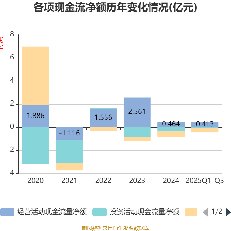 2025年前三季度,公司经营活动现金流净额为4133.85万元,同比增长20.73%;筹资活动现金流净额-3505.92万元,同比增加949.62万元;投资活动现金流净额-1007.84万元,上年同期为-2708.41万元。